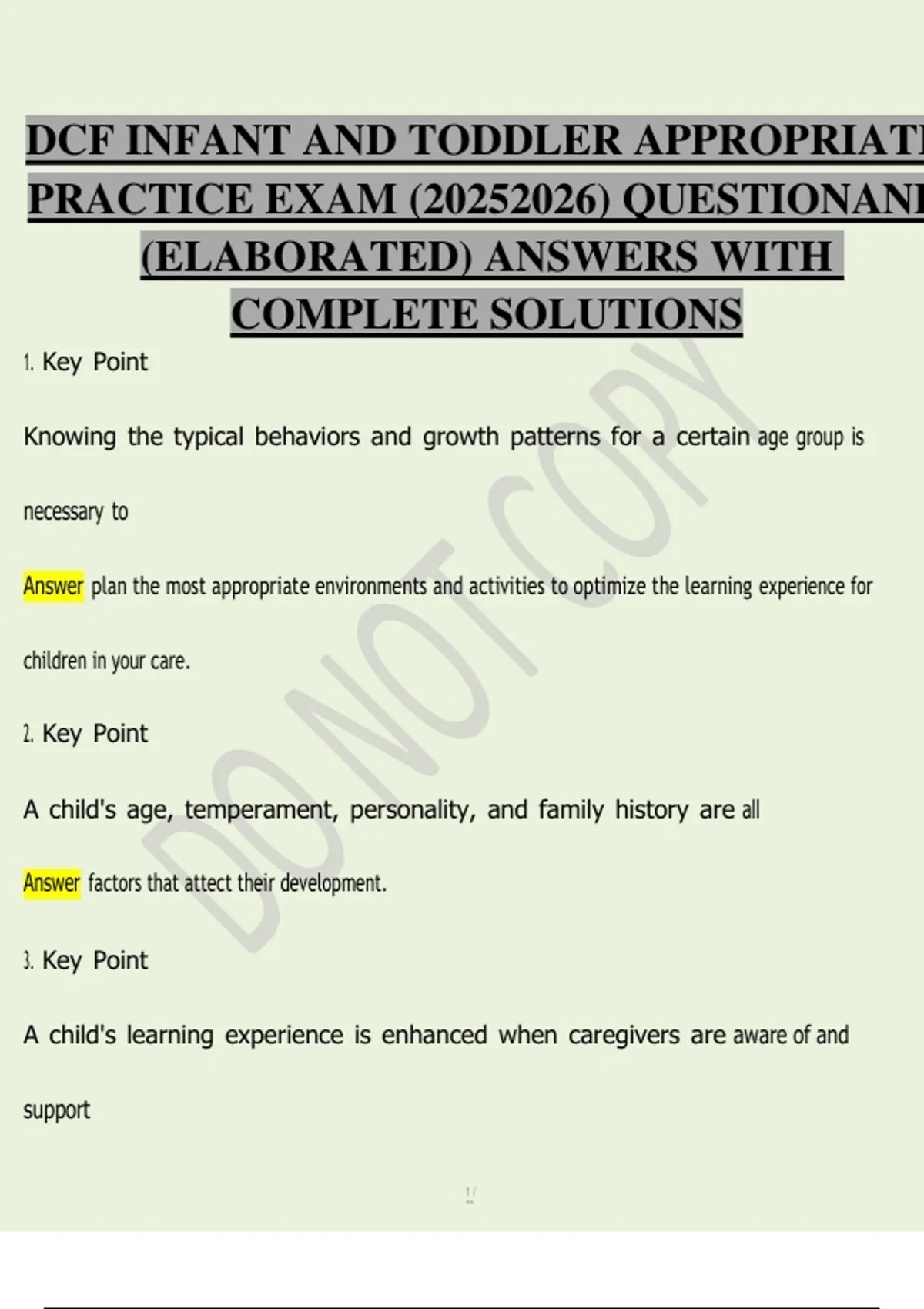 This document is a comprehensive exam preparation guide for the DCF Infant and Toddler Appropriate Practice Exam (2025–2026), featuring elaborated questions with complete, verified answers aligned with Florida DCF training standards. It covers all essential topics, including child growth vs development, developmental domains, infant and toddler temperament, cultural and social context, NAEYC classifications, Developmentally Appropriate Practice (DAP), Piaget’s cognitive development stages, Erikson’s psychosocial stages, attachment and bonding, play-based learning, curriculum design, learning environments, supervision and safety, routines, guidance strategies, behavior management, shaken baby syndrome, and Florida childcare regulations. Designed for childcare providers, early childhood educators, and DCF certification candidates, this guide mirrors official exam wording and true/false structure while providing clear explanations that reinforce understanding. Its depth and clarity make it ideal for first-time exam takers, refresher training, and last-minute review, helping candidates pass the exam with confidence.