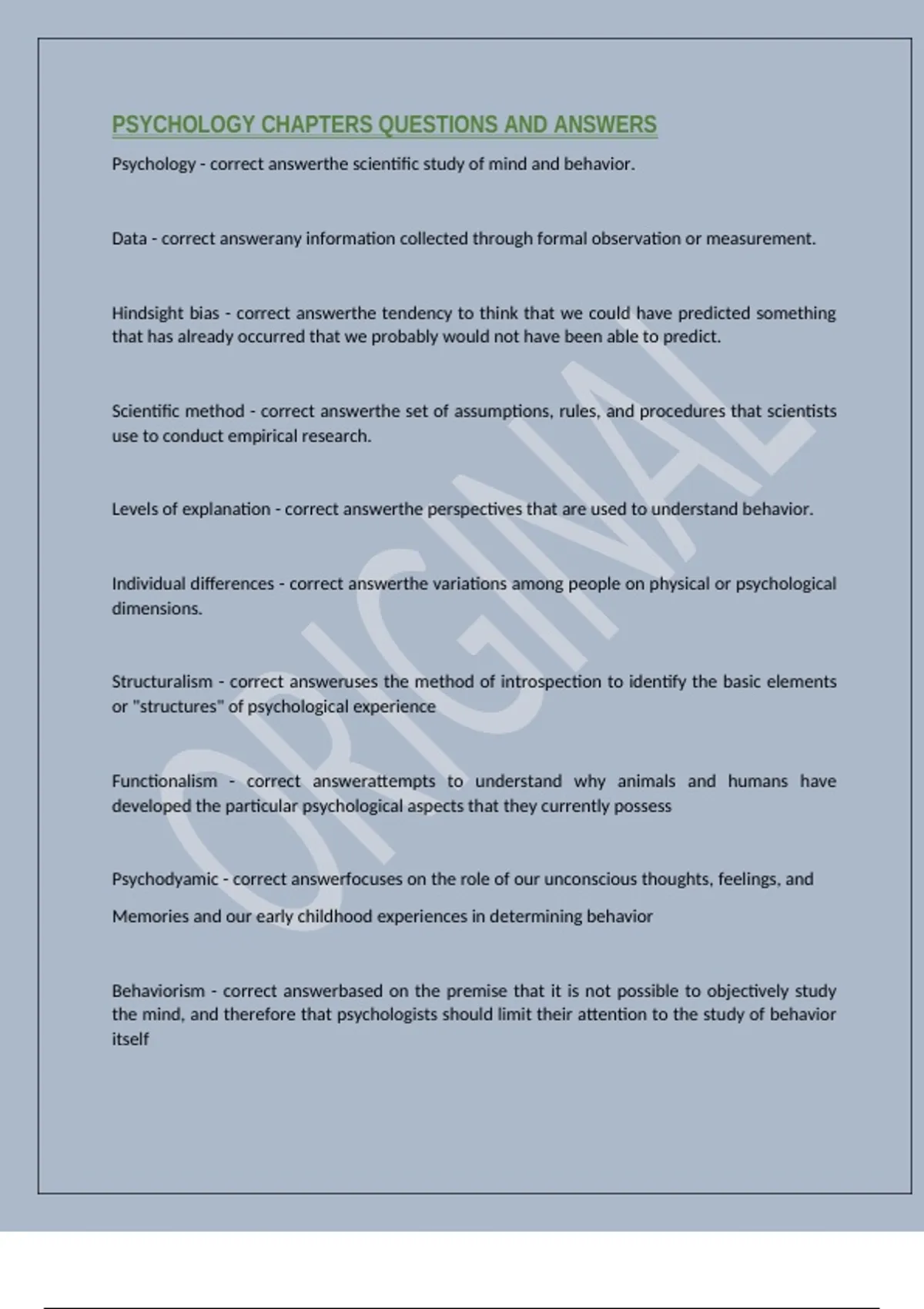 PSYCHOLOGY CHAPTERS QUESTIONS AND ANSWERS
