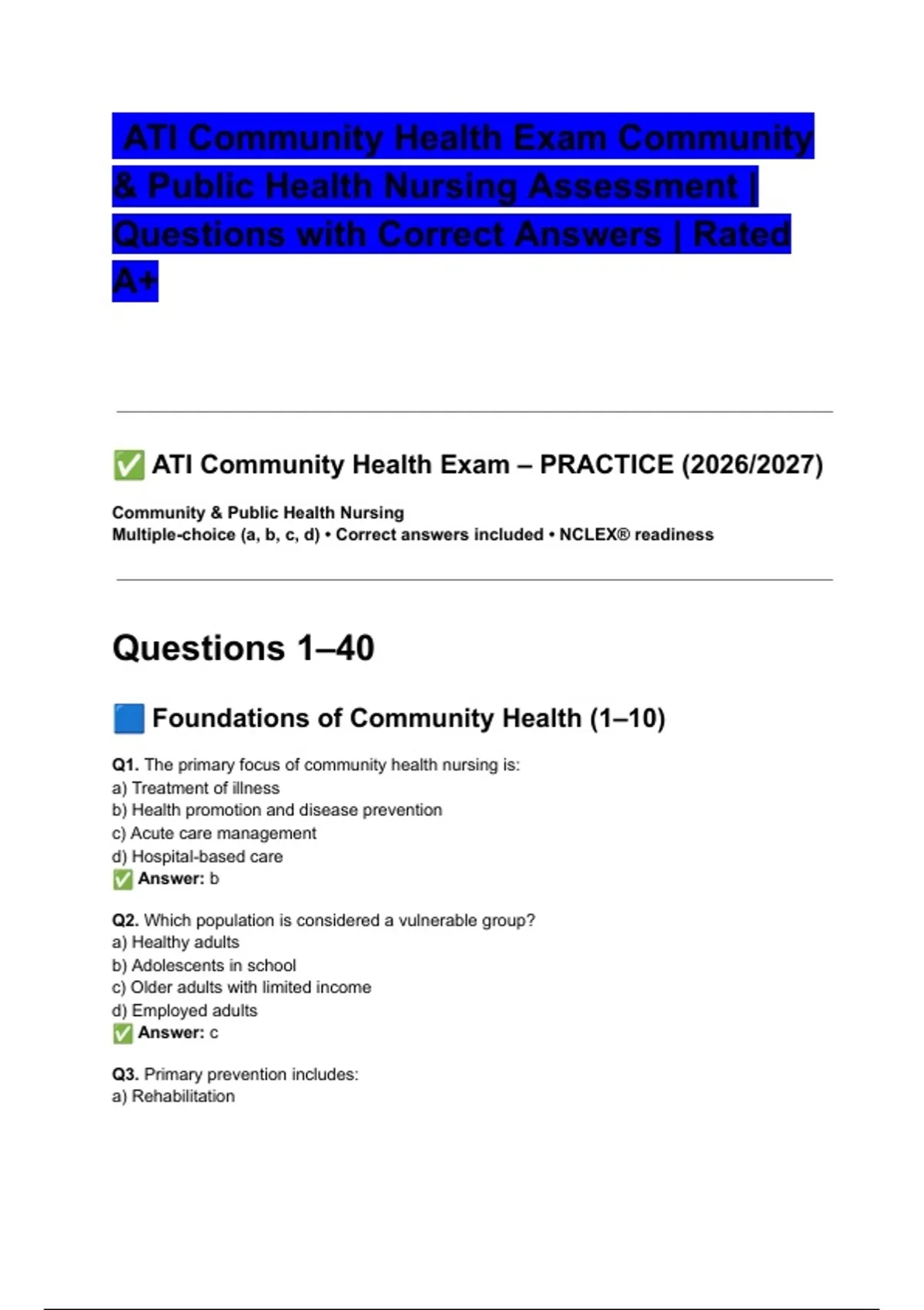 ATI Community Health Exam Community & Public Health Nursing Assessment _ Questions with Correct Answers _ Rated A+.pdf