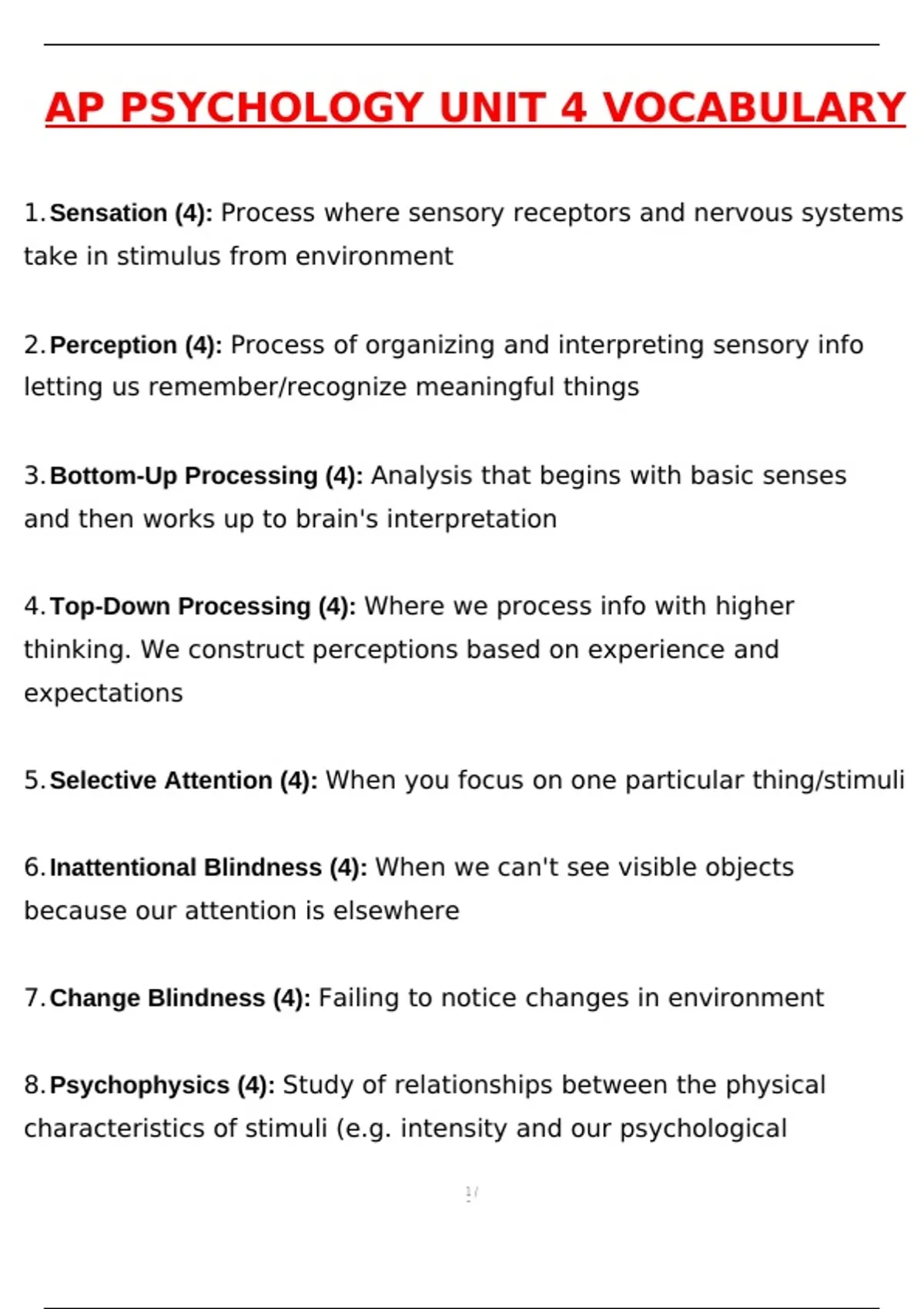 1.Sensation (4): Process where sensory receptors and nervous systems