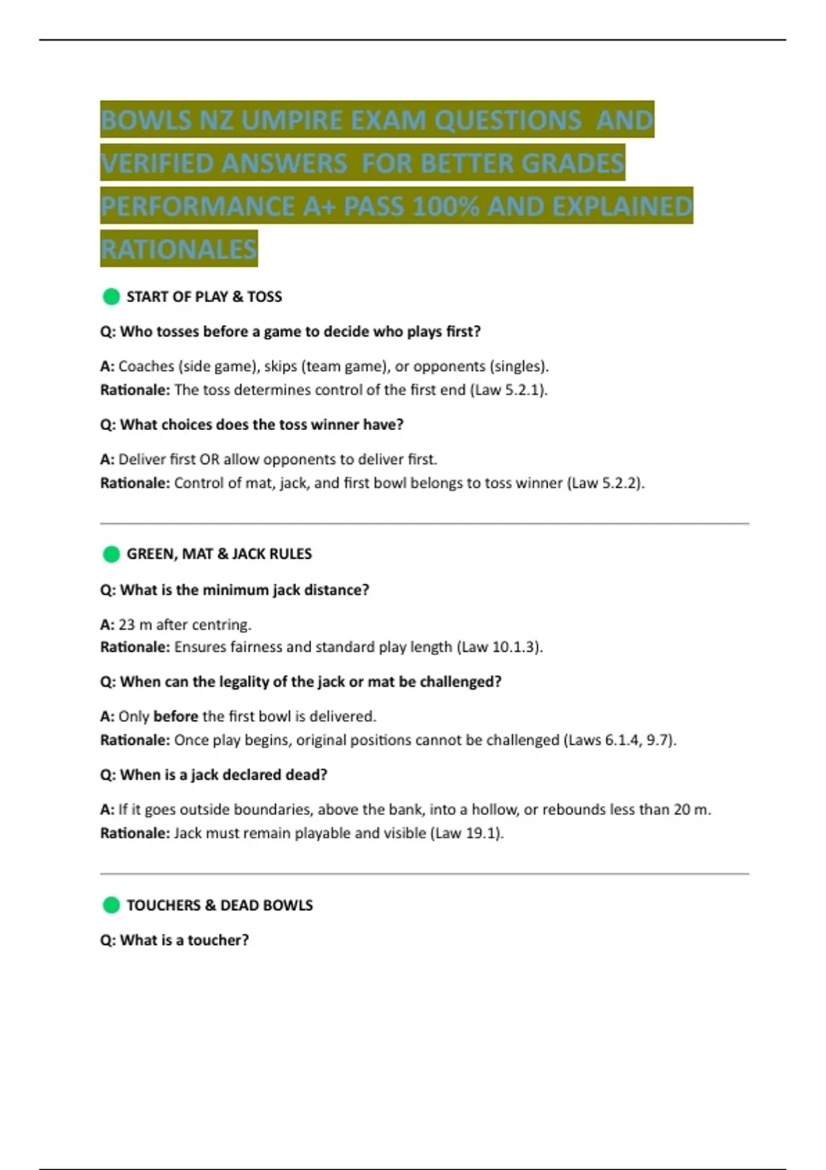 BOWLS NZ UMPIRE EXAM QUESTIONS AND VERIFIED ANSWERS FOR BETTER GRADES PERFORMANCE A+ PASS 100% AND EXPLAINED RATIONALESBOWLS NZ UMPIRE EXAM QUESTIONS AND VERIFIED ANSWERS FOR BETTER GRADES PERFORMANCE A+ PASS 100% AND EXPLAINED RATIONALES