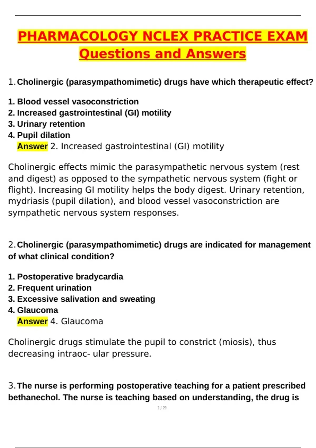2.Cholinergic (parasympathomimetic) drugs are indicated for management