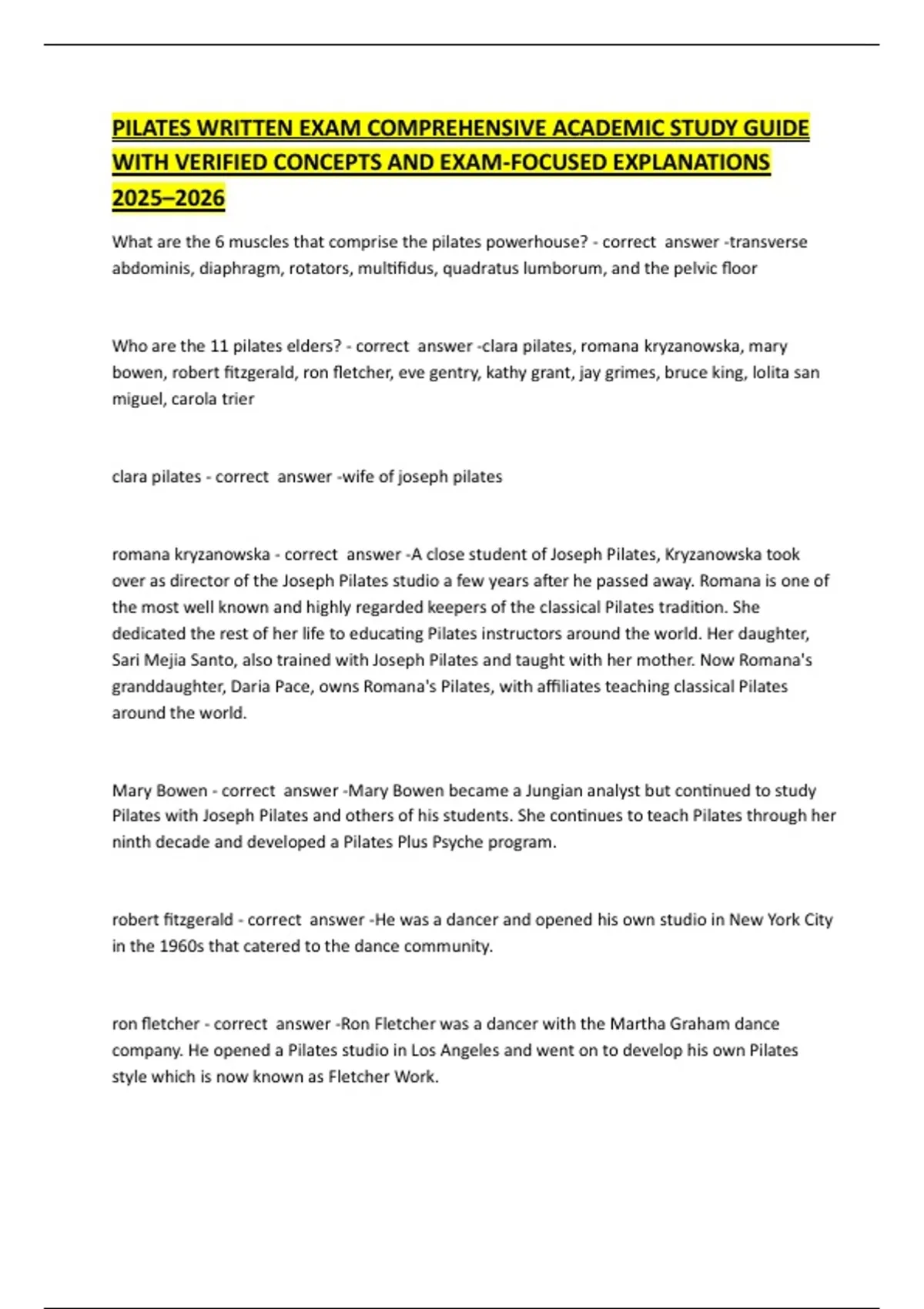 PILATES WRITTEN EXAM COMPREHENSIVE ACADEMIC STUDY GUIDE WITH VERIFIED CONCEPTS AND EXAM-FOCUSED EXPLANATIONS 2025–2026