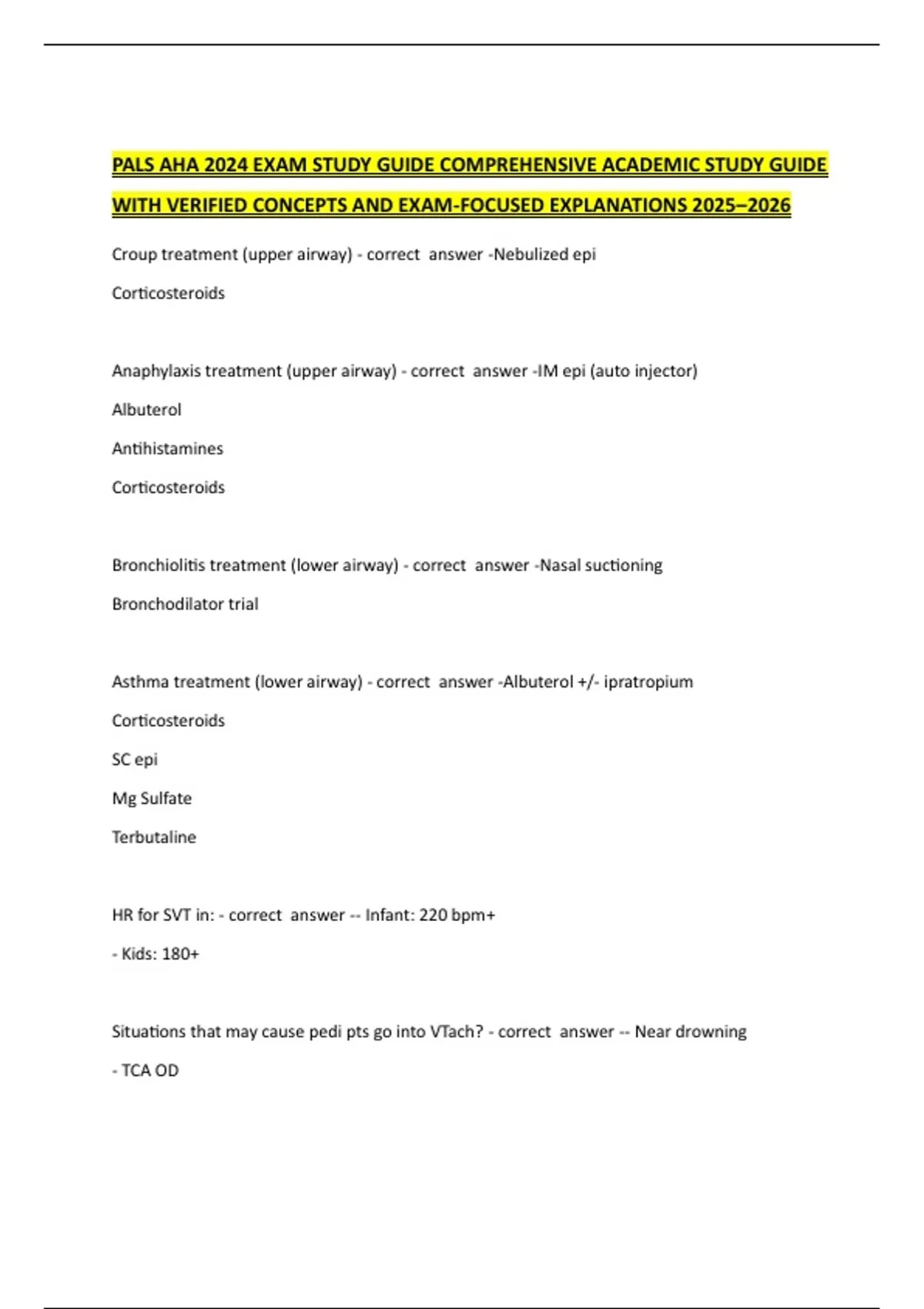 PALS AHA 2024 EXAM STUDY GUIDE COMPREHENSIVE ACADEMIC STUDY GUIDE WITH VERIFIED CONCEPTS AND EXAM-FOCUSED EXPLANATIONS 2025–2026