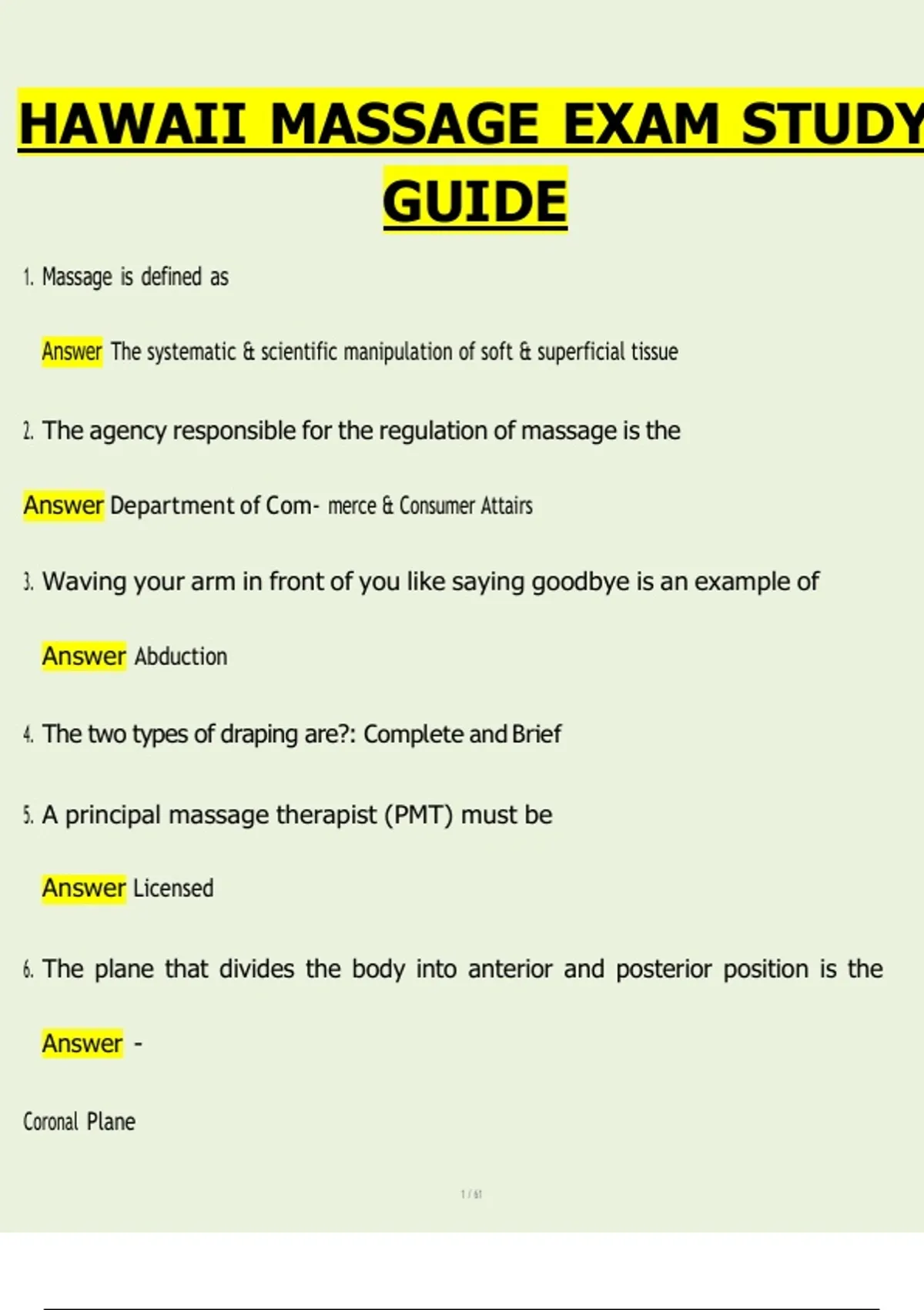 This document is a comprehensive and exam-focused study guide designed to prepare students for the Hawaii State Massage Therapy Licensing Exam. It covers all essential material tested on the exam, including anatomy and physiology, kinesiology, massage techniques, contraindications, pathology, professional ethics, hygiene, and Hawaii massage laws and regulations. The guide is structured in a clear question-and-answer format across more than 60 pages, making it ideal for both intensive exam revision and long-term study. It aligns closely with Massage Board requirements and is suitable for apprentices, massage therapy students, and exam retakers seeking a complete and reliable resource.