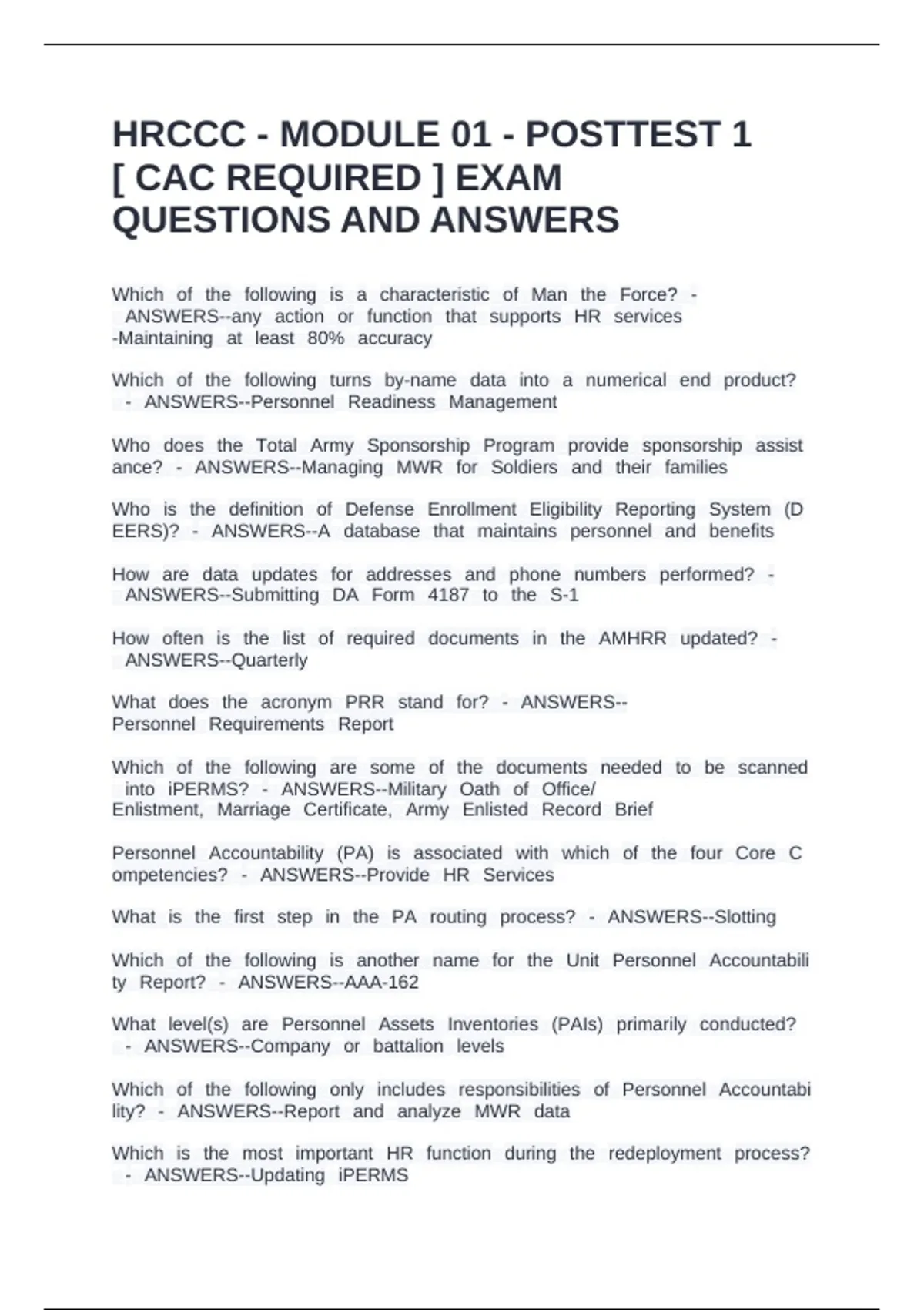 HRCCC - MODULE 01 - POSTTEST 1 [ CAC REQUIRED ] EXAM QUESTIONS AND ANSWERS