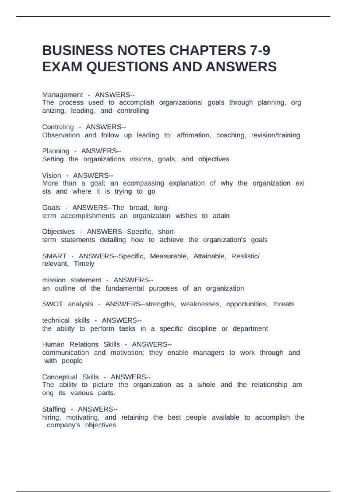 BUSINESS NOTES CHAPTERS 7-9 EXAM QUESTIONS AND ANSWERS