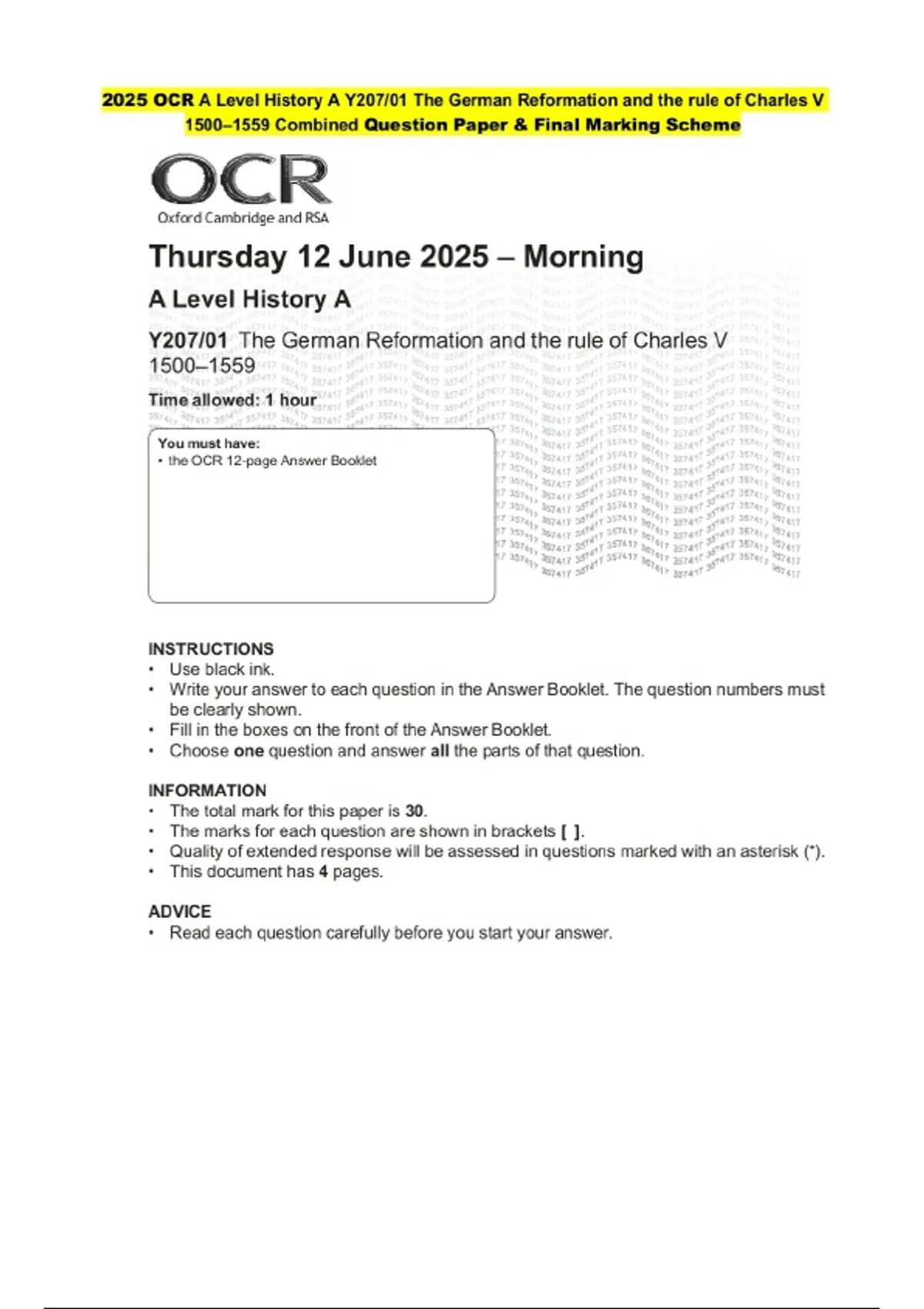 2025 OCR A Level History A Y207/01 The German Reformation and the rule of Charles V 1500–1559 Combined Question Paper and Marking Scheme