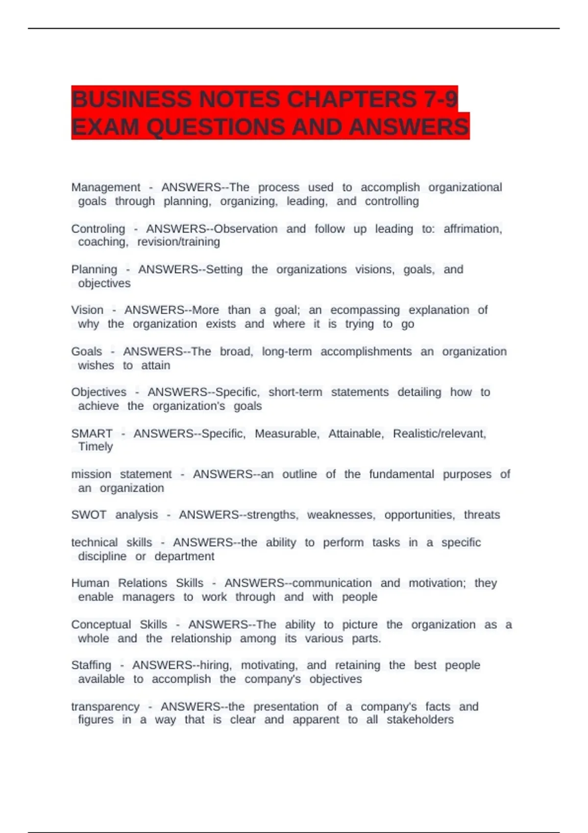 BUSINESS NOTES CHAPTERS 7-9 EXAM QUESTIONS AND ANSWERS