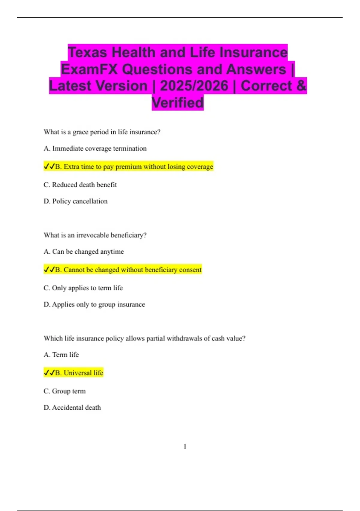 Texas Health and Life Insurance ExamFX Questions and Answers | Latest Version | 2025/2026 | Correct & Verified What is a grace period in life insurance? A. Immediate coverage termination B. Extra time to pay premium without losing coverage C. Reduced death benefit D. Policy cancellation What is an irrevocable beneficiary? A. Can be changed anytime B. Cannot be changed without beneficiary consent C. Only applies to term life D. Applies only to group insurance Which life insurance policy allows partial withdrawals of cash value? A. Term life B. Universal life C. Group term D. Accidental death 2 What is an accidental death benefit? A. Pays extra if death occurs due to accident B. Refunds premiums C. Reduces cash value D. Pays for medical bills Which rider allows a disabled insured to skip premium payments? A. Accidental death rider B. Waiver of premium rider C. Guaranteed insurability rider D. Children’s term rider What is a conversion option in group term life insurance? A. Change beneficiary B. Convert to individual permanent policy without medical exam C. Reduce premium D. Cancel coverage Which health insurance covers lost income due to illness or injury? A. Major medical B. Disability income insurance C. Term life insurance D. Long-term care insurance 3 What is a copayment in health insurance? A. Maximum policy limit B. Fixed amount paid per service C. Deductible D. Coinsurance Which type of health insurance pays a fixed amount for each day in the hospital? A. Disability insurance B. Major medical insurance C. Hospital indemnity insurance D. Long-term care insurance What is coinsurance? A. Premium payment B. Percentage of costs shared between insurer and insured C. Deductible D. Policy limit Which provision in a health policy outlines duties after a loss? A. Declarations B. Conditions C. Insuring agreement 4 D. Exclusions What is a pre-existing condition? A. New illness after policy issuance B. Condition existing before policy issuance C. Injury caused by accident D. Condition excluded by choice Which health insurance plan requires members to use network providers? A. HMO B. PPO C. POS D. Indemnity What is a deductible? A. Coinsurance B. Premium payment C. Amount the insured pays before benefits apply D. Maximum benefit Which type of life insurance allows cash value to fluctuate with investments? A. Term life B. Whole life