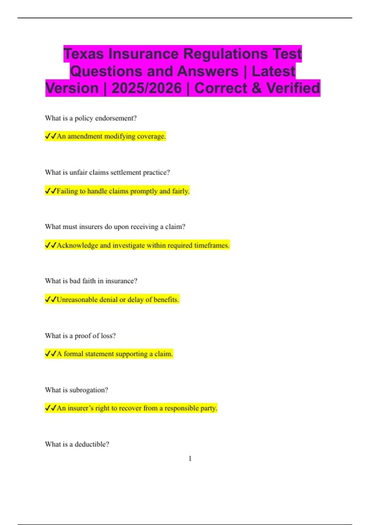 Texas Insurance Regulations Test Questions and Answers | Latest Version | 2025/2026 | Correct & Verified What is a policy endorsement? An amendment modifying coverage. What is unfair claims settlement practice? Failing to handle claims promptly and fairly. What must insurers do upon receiving a claim? Acknowledge and investigate within required timeframes. What is bad faith in insurance? Unreasonable denial or delay of benefits. What is a proof of loss? A formal statement supporting a claim. What is subrogation? An insurer’s right to recover from a responsible party. What is a deductible? 2 The amount the insured pays before coverage applies. What is coinsurance? Sharing of loss between insurer and insured. What is policy replacement regulation intended to prevent? Unnecessary loss of benefits to consumers. What is a notice of hearing? Formal notification of regulatory proceedings. What is due process in insurance regulation? The right to fair procedures before penalties. What is an authorized insurer? An insurer licensed to operate in Texas. What is an unauthorized insurer? An insurer not licensed in Texas. What is disclosure in insurance transactions? Providing required information to consumers. 3 What is the goal of Texas insurance regulation overall? To maintain a stable, fair, and consumer-protective insurance market. What is the primary purpose of Texas insurance regulations? To protect consumers and ensure fair insurance practices. Which agency enforces insurance laws in Texas? The Texas Department of Insurance. What is an insurance producer? An individual licensed to sell, solicit, or negotiate insurance. What must an individual obtain before selling insurance in Texas? A valid Texas insurance license. What is an insurer required to file with the state before offering policies? Policy forms and rates for approval or review. What does “certificate of authority” mean? Permission granted to an insurer to operate in Texas. 4 What happens if an insurer operates without a certificate of authority? The insurer may face fines and enforcement actions. What is unfair discrimination in insurance? Treating similar risks differently without justification. What is rebating in insurance? Offering inducements not stated in the policy to secure business. Is rebating legal in Texas insurance transactions?