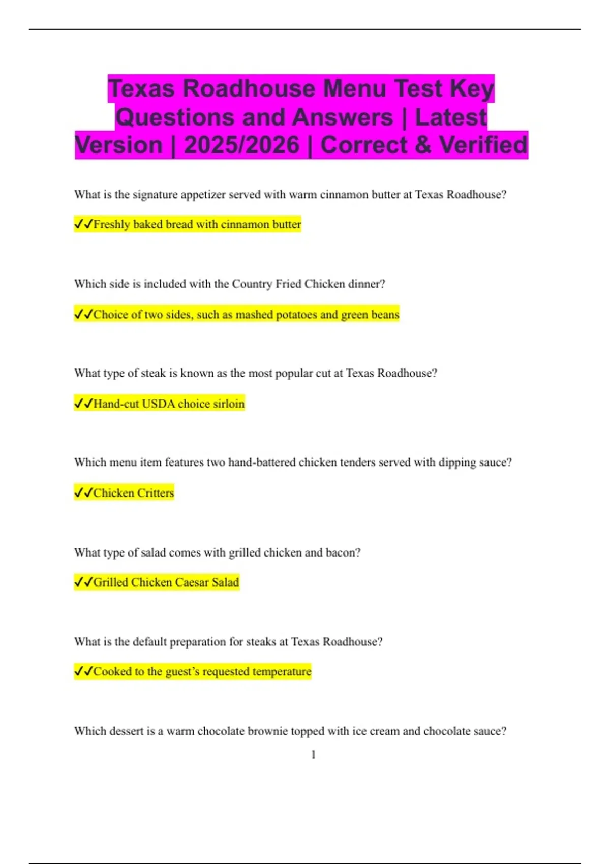 Texas Roadhouse Menu Test Key Questions and Answers | Latest Version | 2025/2026 | Correct & Verified What is the signature appetizer served with warm cinnamon butter at Texas Roadhouse? Freshly baked bread with cinnamon butter Which side is included with the Country Fried Chicken dinner? Choice of two sides, such as mashed potatoes and green beans What type of steak is known as the most popular cut at Texas Roadhouse? Hand-cut USDA choice sirloin Which menu item features two hand-battered chicken tenders served with dipping sauce? Chicken Critters What type of salad comes with grilled chicken and bacon? Grilled Chicken Caesar Salad What is the default preparation for steaks at Texas Roadhouse? Cooked to the guest’s requested temperature Which dessert is a warm chocolate brownie topped with ice cream and chocolate sauce? 2 Big Ol’ Brownie What comes with the Ribs & BBQ Chicken combo? Half rack of ribs and a grilled BBQ chicken breast with two sides Which seafood entrée is available at Texas Roadhouse? Grilled salmon What sauce is served with the Grilled Shrimp dinner? Garlic butter sauce Which appetizer is served with fried pickles and ranch dressing? Fried Pickles What type of potatoes are served with the Sirloin & Shrimp combo? Choice of baked potato, mashed potatoes, or seasoned rice Which menu item is a 6 oz. sirloin served with two sides? Junior Sirloin What dessert features a flaky pastry with cinnamon sugar and icing? Cinnamon Butter Pecan Pie 3 Which lunch special comes with a side salad and choice of one side? Roadhouse Burger Lunch Which steak is hand-cut and known for its tenderness and marbling? Ribeye Which sauce is served with the Chicken Critters Platter? Creamy ranch or BBQ sauce What type of dressing is offered with the House Salad? Ranch, Italian, Thousand Island, Honey Mustard, or Bleu Cheese Which entrée is served with a baked potato and fresh vegetables? Grilled Pork Chop What comes with the Sirloin & Ribs combo? 6 oz. sirloin and half rack of ribs with two sides Which menu item is a 10 oz. hand-cut sirloin?