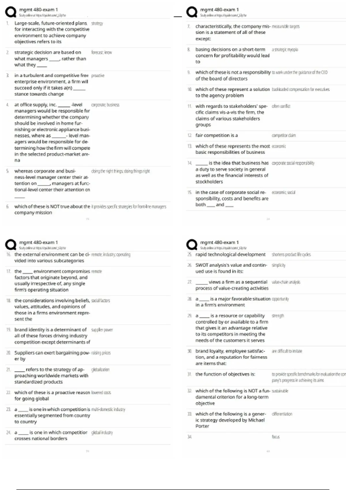 MGMT480 Exam 1 comprehensive study guide covering strategic management foundations, vision and mission, external and internal analysis, SWOT, competitive advantage, and strategy formulation. Ideal for MGMT480 students preparing for midterms, tests, and exams (2025).