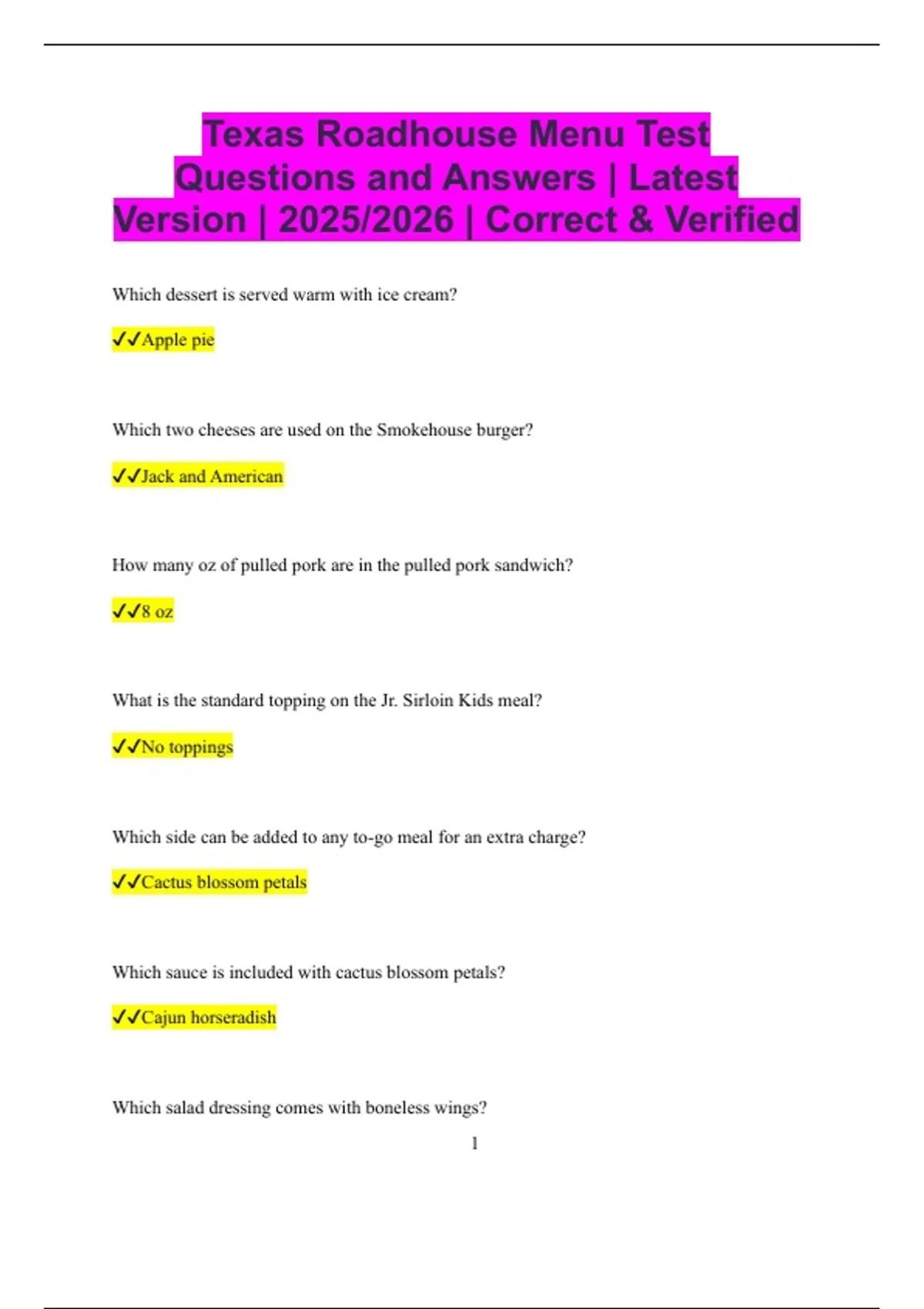 Texas Roadhouse Menu Test Questions and Answers | Latest Version | 2025/2026 | Correct & Verified
