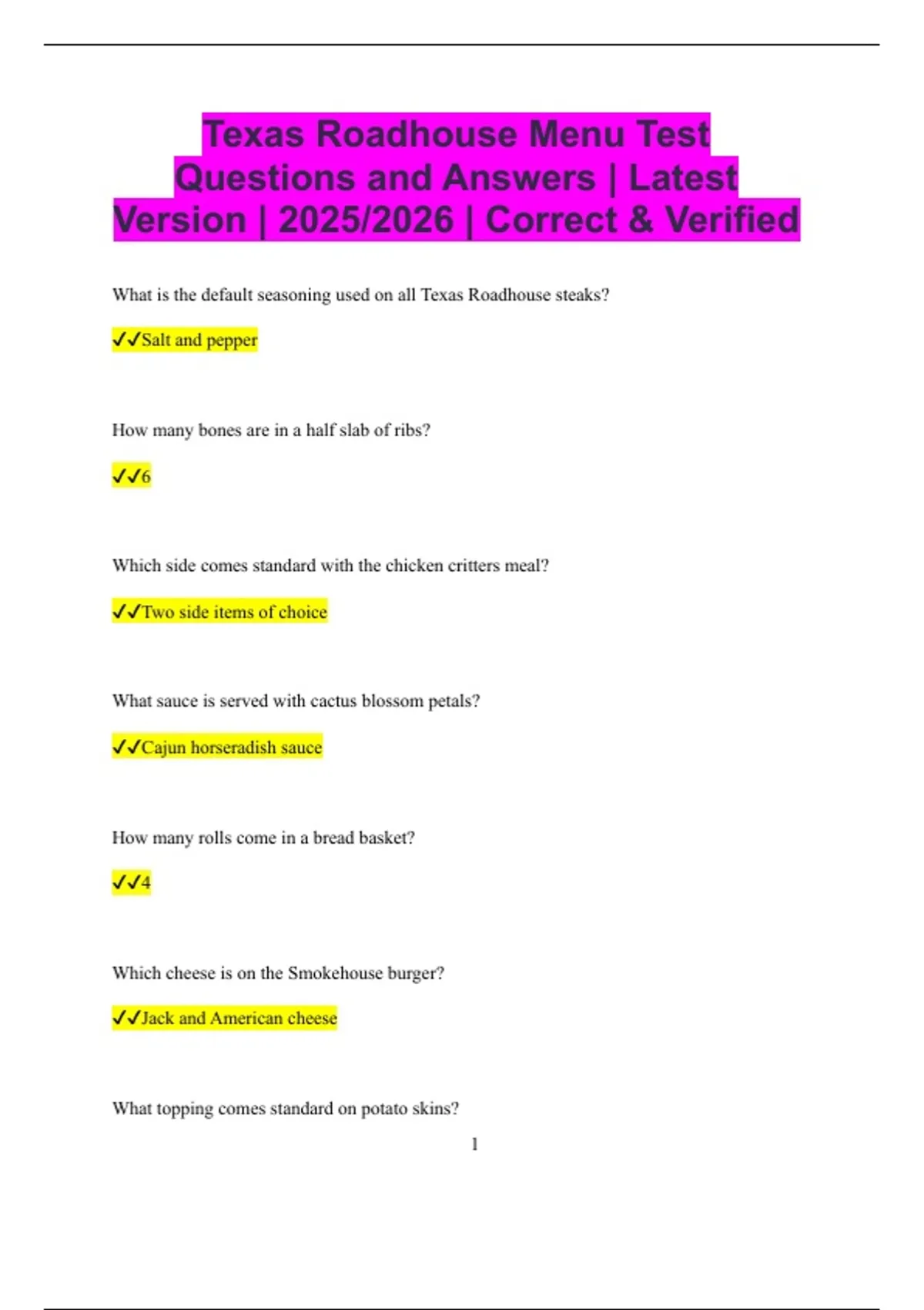 Texas Roadhouse Menu Test Questions and Answers | Latest Version | 2025/2026 | Correct & Verified What is the default seasoning used on all Texas Roadhouse steaks? Salt and pepper How many bones are in a half slab of ribs? 6 Which side comes standard with the chicken critters meal? Two side items of choice What sauce is served with cactus blossom petals? Cajun horseradish sauce How many rolls come in a bread basket? 4 Which cheese is on the Smokehouse burger? Jack and American cheese What topping comes standard on potato skins? 2 Cheddar cheese and bacon How many pieces of fried pickles are served in a to-go appetizer? 10–12 pieces What dressing comes with boneless wings? Bleu cheese Which dessert is served warm with a scoop of vanilla ice cream? Apple pie What type of butter is served with fresh vegetables? Lemon pepper butter How many shrimp are served in the grilled shrimp dinner? 10 Which steak is the most tender on the menu? Filet Which steak is the most marbled and flavorful? Ribeye 3 What topping is served on smothered chicken? Sautéed onions and mushrooms Which steak is the leanest option? Sirloin How many ounces are in a standard pork chop entrée? 7–8 oz What sauce comes on BBQ chicken dinner? BBQ sauce already on the chicken What is the standard topping on beef tips? Brown gravy with sautéed onions and mushrooms Which side is optional on any to-go meal? Cactus blossom petals Which dessert is topped with chocolate sauce and a scoop of vanilla ice cream? Brownie 4 How many ounces of pulled pork are in the pulled pork sandwich? 8 oz Which sauce is standard with fried pickles, rattlesnake bites, and cactus blossom? Cajun horseradish sauce What type of bun comes on all burgers? Sesame seed bun