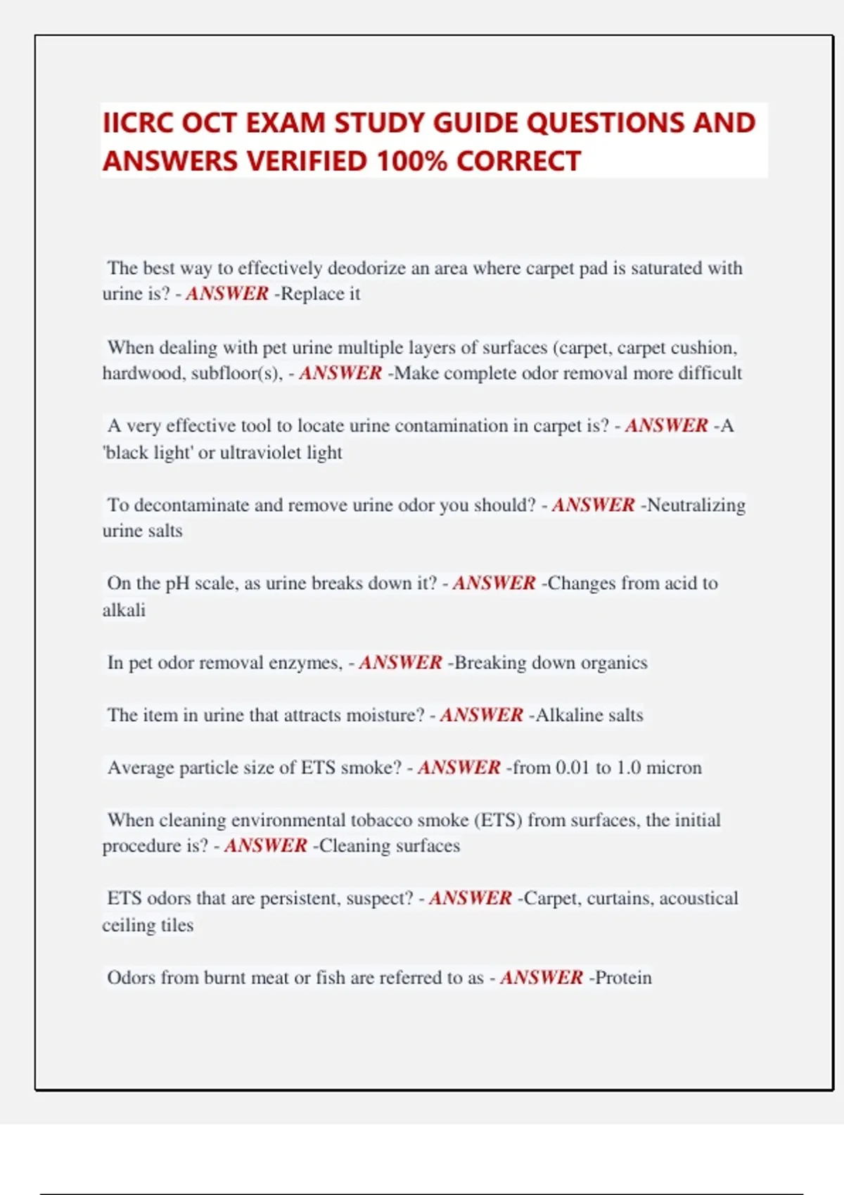 IICRC OCT EXAM STUDY GUIDE QUESTIONS AND ANSWERS VERIFIED 100% CORRECT The best way to effectively deodorize an area where carpet pad is saturated with urine is? - ANSWER -Replace it When dealing with pet urine multiple layers of surfaces (carpet, carpet cushion, hardwood, subfloor(s), - ANSWER -Make complete odor removal more difficult A very effective tool to locate urine contamination in carpet is? - ANSWER -A 'black light' or ultraviolet light To decontaminate and remove urine odor you should? - ANSWER -Neutralizing urine salts On the pH scale, as urine breaks down it? - ANSWER -Changes from acid to alkali In pet odor removal enzymes, - ANSWER -Breaking down organics The item in urine that attracts moisture? - ANSWER -Alkaline salts Average particle size of ETS smoke? - ANSWER -from 0.01 to 1.0 micron When cleaning environmental tobacco smoke (ETS) from surfaces, the initial procedure is? - ANSWER -Cleaning surfaces ETS odors that are persistent, suspect? - ANSWER -Carpet, curtains, acoustical ceiling tiles Odors from burnt meat or fish are referred to as - ANSWER -Protein Most indoor fungi grow better in? - ANSWER -68 F (20C) to 86 F (30C) MVOC's are? - ANSWER -Produced by microorganisms Number one element required for microbial growth? - ANSWER -Sufficient moisture or water activity When removing odors from body fluids or OPIM (other potentially infectious materials)? - ANSWER -Technicians shall don appropriate PPE to protect any route(s) of exposure Odors as a result of biological contaminants, the initial concern of a technician shall be to consider? - ANSWER -All body substances could contain infectious materials Odors as a result of biological contaminants are due to decomposing? - ANSWER -Protein Odors as a result of biological contaminants are best removed when deodorizing agents and equipment use - ANSWER -Oxidizing reactions (gas and liquid) A complication in removing odors caused by small dead animals is - ANSWER Finding the carcass Products for treating malodors caused by skunk spray or protein decomposition on durable surfaces is? - ANSWER -A liquid oxidizer A treatment for severe protein odor (e.g., milk, fish, eggs) is? - ANSWER -Using enzyme deodorants A first step, if practical, in removing odors from new materials, such as a new carpet odor, is? - ANSWER -Ventilating (air exchange) Thermal foggers produce water droplets in what micron range? - ANSWER -0.5-2 Safety is the responsibility of? - ANSWER -Everyone Assume that bodily fluids, blood or OPIM, - ANSWER -Could contain infectious materials Pathogenic means? - ANSWER -disease causing Hepatitis is a disease associated with the? - ANSWER -Liver HEP(B) vaccines are administered over? - ANSWER -A 3 shot series Treating all blood, body discharge and OPIM as if they are infectious is referred to as? - ANSWER -Universal Precautions The organization that regulates antimicrobials is? - ANSWER -Environmental Protection Agency (EPA) Technicians should consider wearing what at all times during work hours when real or suspected hazards exist? - ANSWER -Proper PPE Ozone is a gaseous oxidizing agent with the chemical symbol? - ANSWER -O3 Ozone in relation to air is? - ANSWER -Heavier Electrically powered devices used to produce an oxidizing odor-control gas? - ANSWER -Ozone Generator Prolonged exposure to ozone gas may damage? - ANSWER -People, pets and natural rubber Signs and symptoms of over exposure to ozone gas include - ANSWER -Dry nose, sore throat, nosebleed