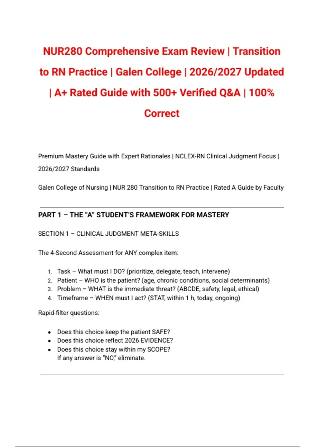 Galen College of Nursing | NUR 280 Transition to RN Practice | Rated A Guide by Faculty