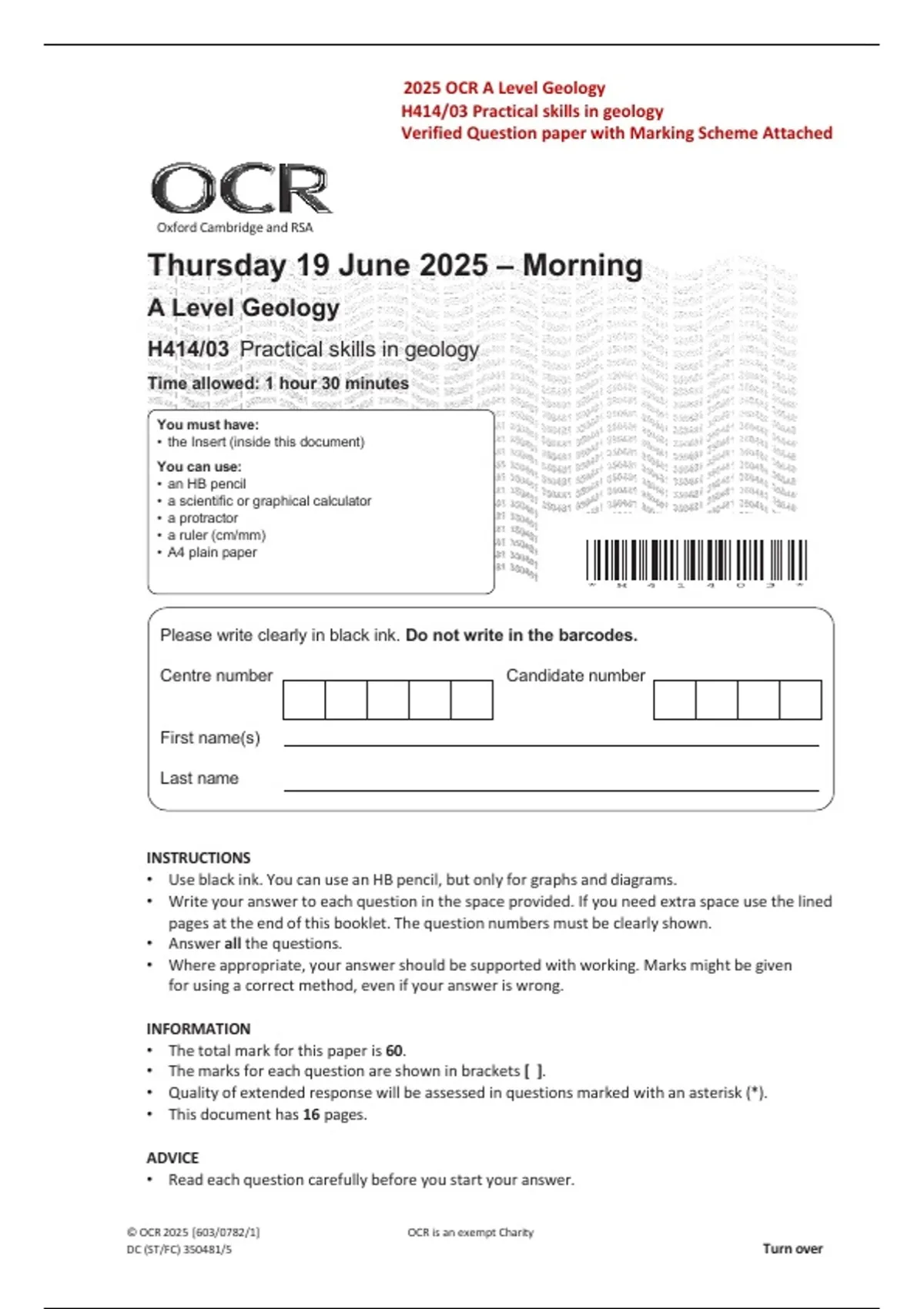 H414/03 Practical skills in geology