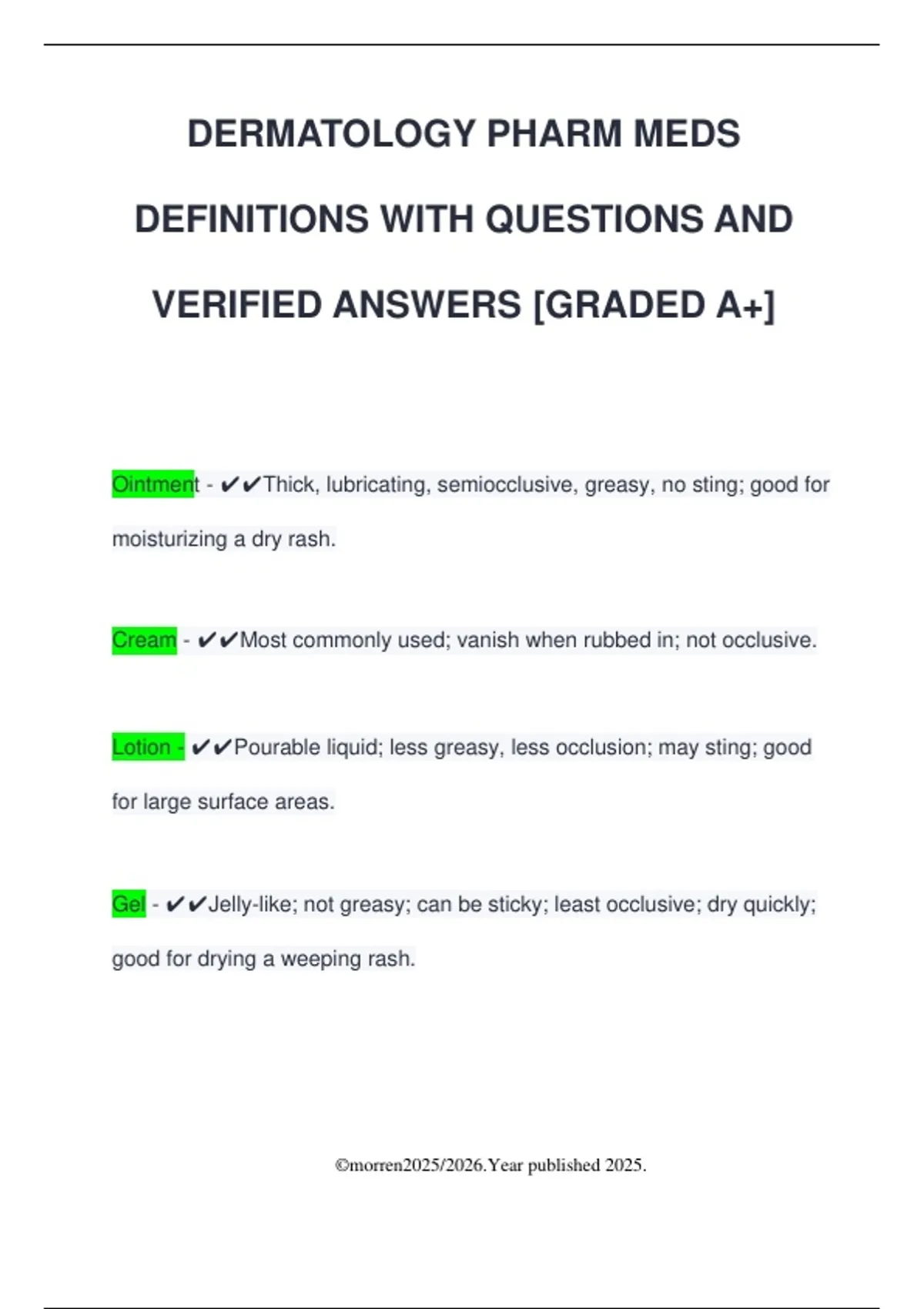 DERMATOLOGY PHARM MEDS DEFINITIONS WITH QUESTIONS AND VERIFIED ANSWERS [GRADED A+] Ointment - Thick, lubricating, semiocclusive, greasy, no sting; good for moisturizing a dry rash. Cream - Most commonly used; vanish when rubbed in; not occlusive. Lotion - Pourable liquid; less greasy, less occlusion; may sting; good for large surface areas. Gel - Jelly-like; not greasy; can be sticky; least occlusive; dry quickly; good for drying a weeping rash. ©morren2025/2026.Year published 2025. Foam - Cosmetically elegant; more expensive; spread easily; good for scalps. Powder - Absorb moisture and decrease friction; good for body creases. Solution - Dropper for a specific location; good for scalps. Oil - Liquid, greasy; good for scalps of dry hair and rash. Spray - Aerosol vs pump; good for large surface area; common to use on scalp. Clobetasol propionate 0.05% - Class 1 (superpotent) topical steroid. Halobetasol propionate 0.05% - Class 1 (superpotent) topical steroid. Desoximetasone 0.25% - Class 2 (potent) topical steroid. ©morren2025/2026.Year published 2025.