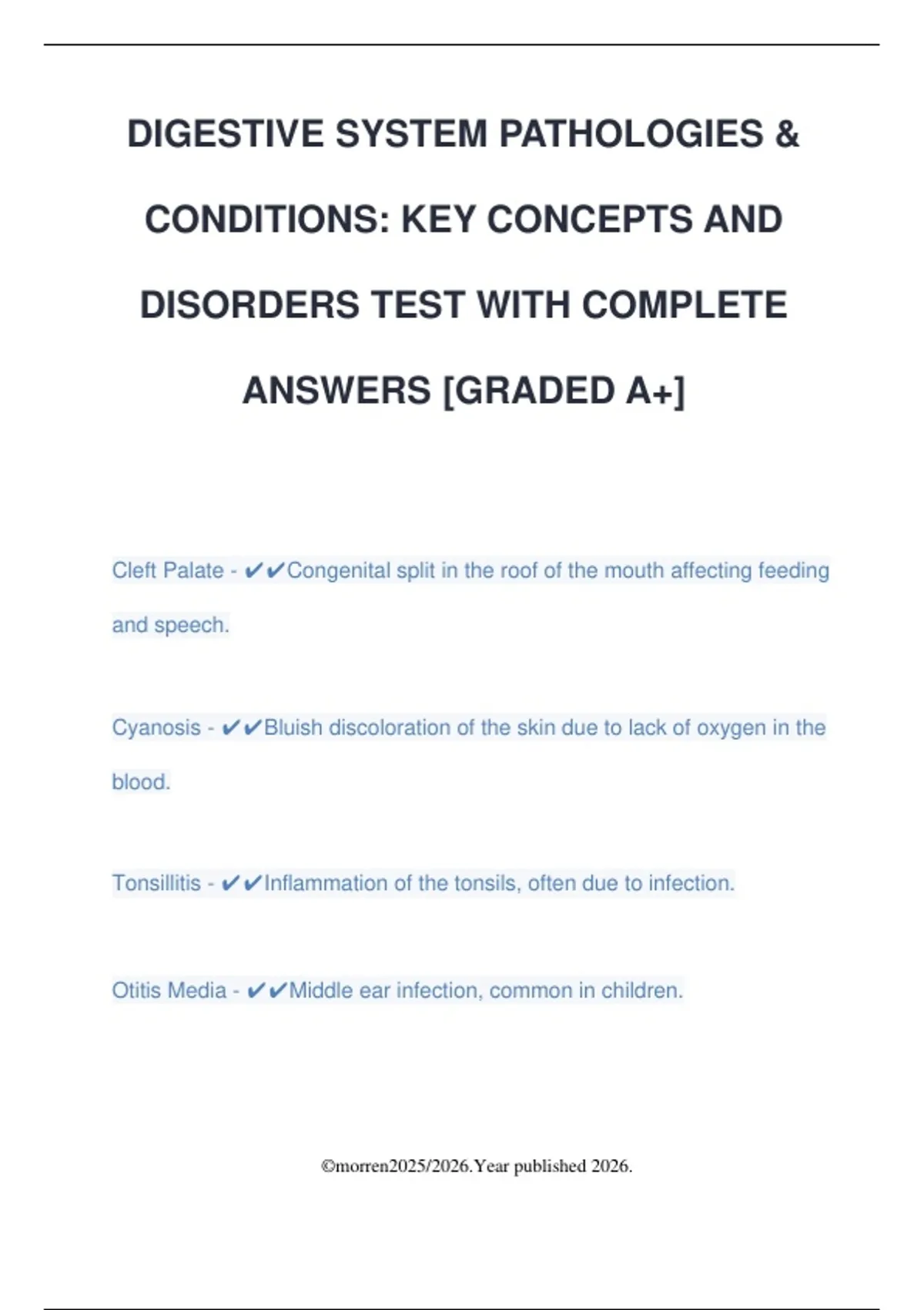 DIGESTIVE SYSTEM PATHOLOGIES & CONDITIONS: KEY CONCEPTS AND DISORDERS TEST WITH COMPLETE ANSWERS [GRADED A+] Cleft Palate - Congenital split in the roof of the mouth affecting feeding and speech. Cyanosis - Bluish discoloration of the skin due to lack of oxygen in the blood. Tonsillitis - Inflammation of the tonsils, often due to infection. Otitis Media - Middle ear infection, common in children. ©morren2025/2026.Year published 2026.
