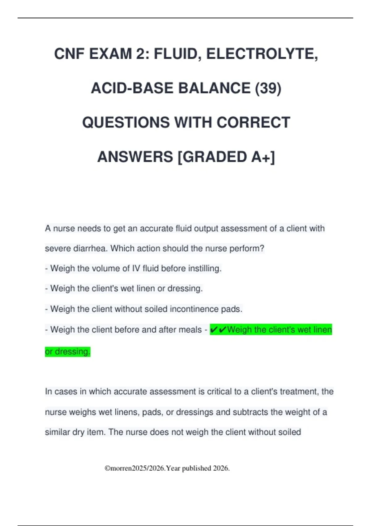CNF EXAM 2: FLUID, ELECTROLYTE, ACID-BASE BALANCE (39) QUESTIONS WITH CORRECT ANSWERS [GRADED A+] A nurse needs to get an accurate fluid output assessment of a client with severe diarrhea. Which action should the nurse perform? - Weigh the volume of IV fluid before instilling. - Weigh the client's wet linen or dressing. - Weigh the client without soiled incontinence pads. - Weigh the client before and after meals - Weigh the client's wet linen or dressing. In cases in which accurate assessment is critical to a client's treatment, the nurse weighs wet linens, pads, or dressings and subtracts the weight of a similar dry item. The nurse does not weigh the client without soiled ©morren2025/2026.Year published 2026. incontinence pads. The nurse does not weigh the client before and after meals to obtain an accurate assessment of the fluid output. A home care nurse is teaching a client and family about the importance of a balanced diet. The nurse determines that the education was successful when the client identifies which of the following as a rich source of potassium? - Dairy products - Apricots - Processed meat - Bread products - Apricots Apricots are a rich source of potassium. Dairy products are rich sources of calcium. Processed meat and bread products provide sodium. An intravenous hypertonic solution containing dextrose, proteins, vitamins, and minerals is known as: - cellular hydration. ©morren2025/2026.Year published 2026.