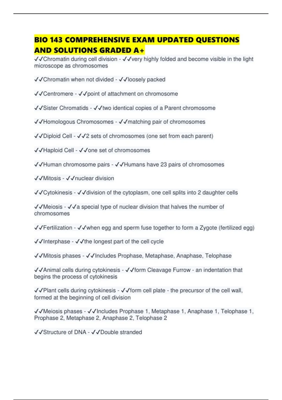 BIO 143 COMPREHENSIVE EXAM UPDATED QUESTIONS AND SOLUTIONS GRADED A+