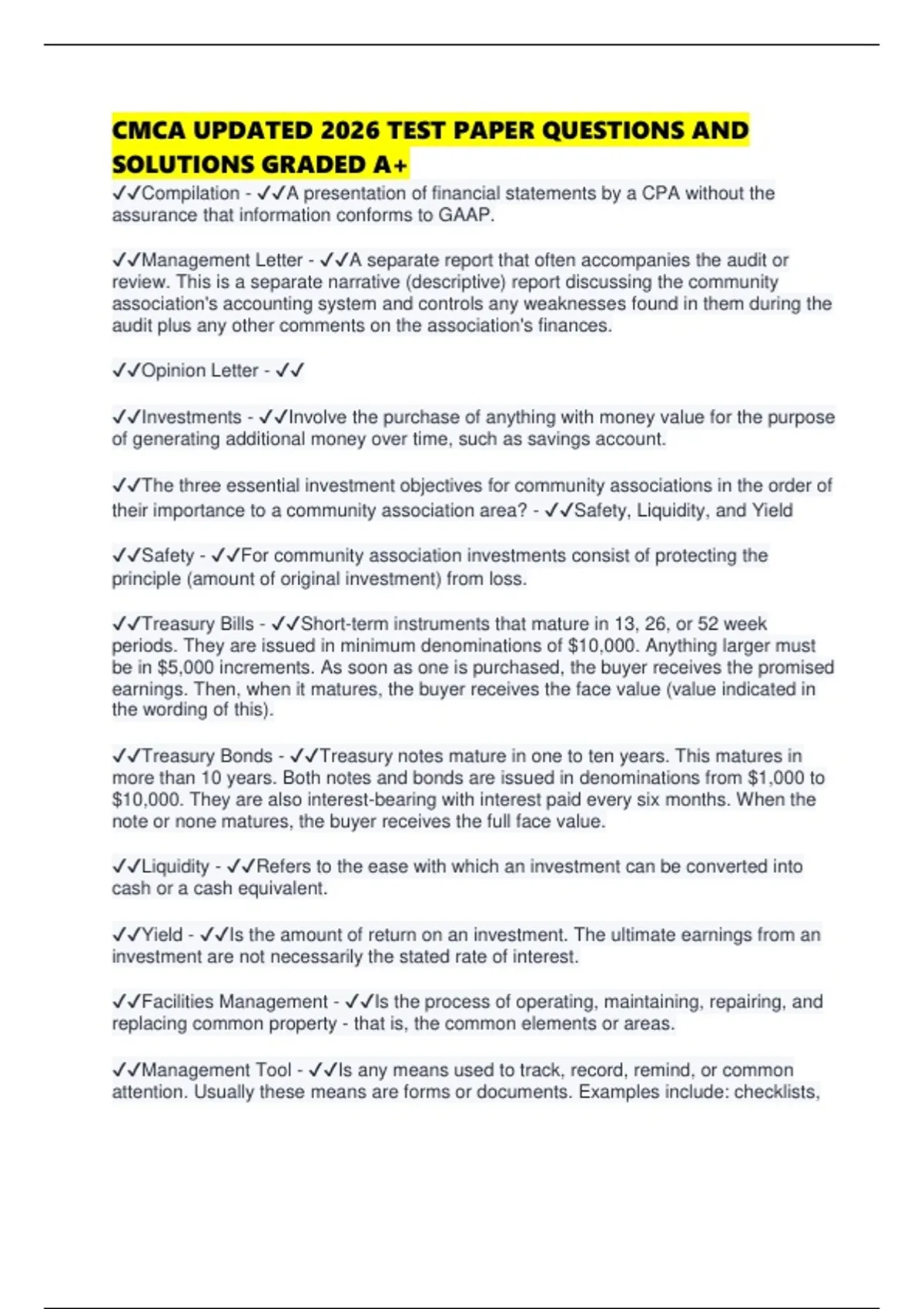 CMCA UPDATED 2026 TEST PAPER QUESTIONS AND SOLUTIONS GRADED A+