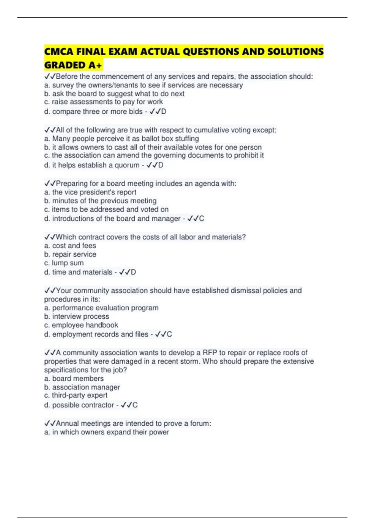 CMCA FINAL EXAM ACTUAL QUESTIONS AND SOLUTIONS