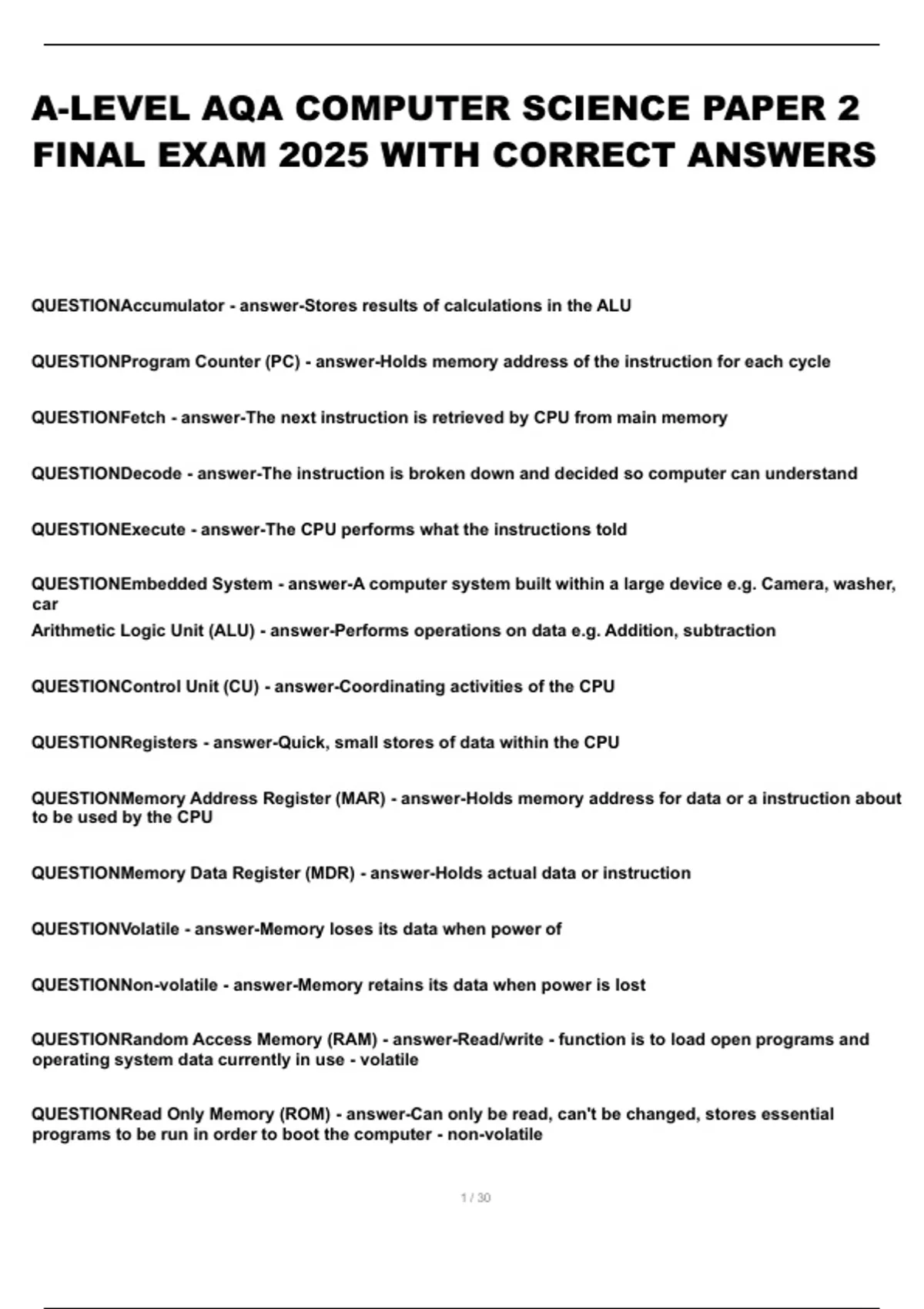 QUESTIONControl Unit (CU) - answer-Coordinating activities of the CPU