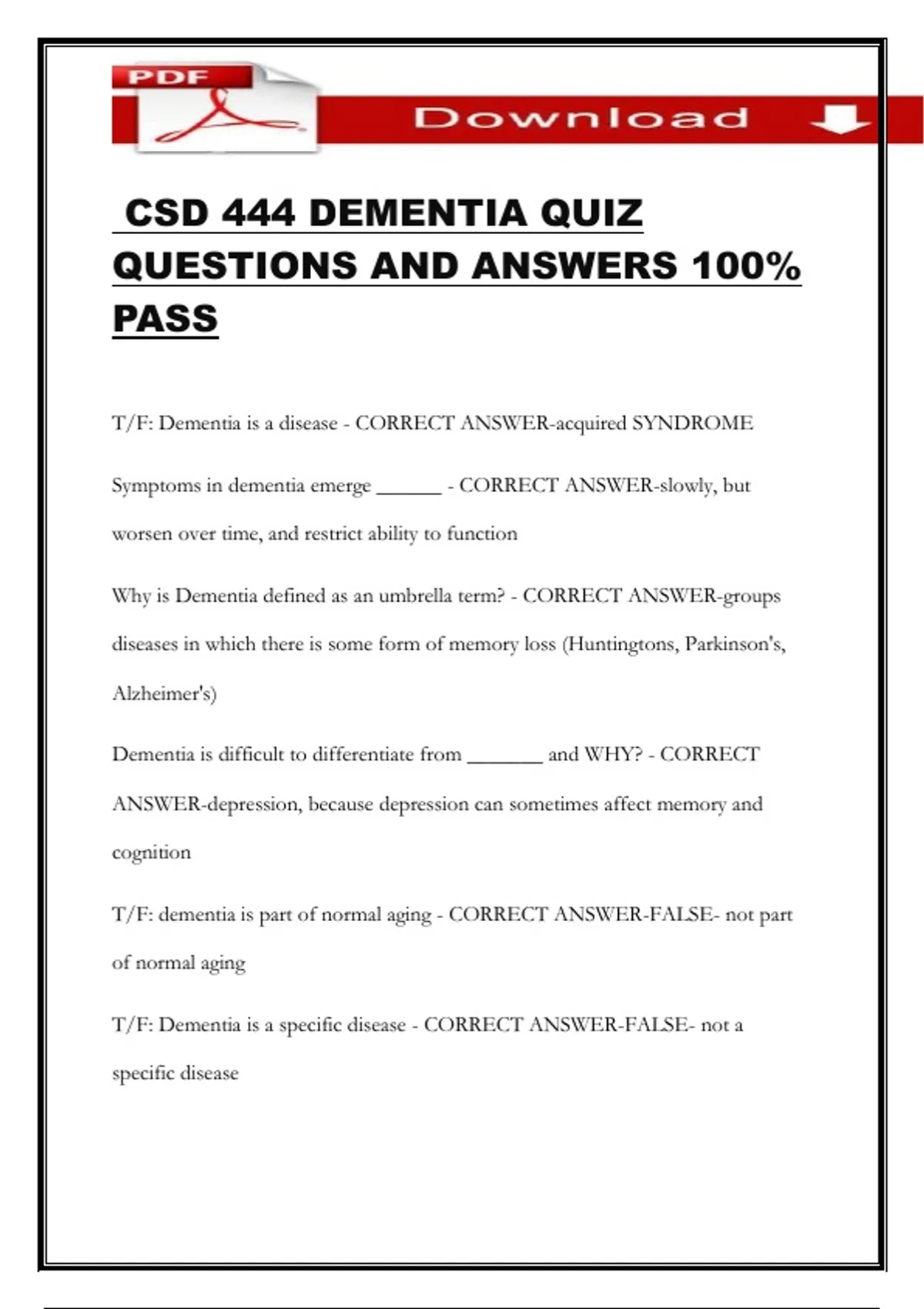 CSD 444 DEMENTIA QUIZ QUESTIONS AND ANSWERS 100% PASS