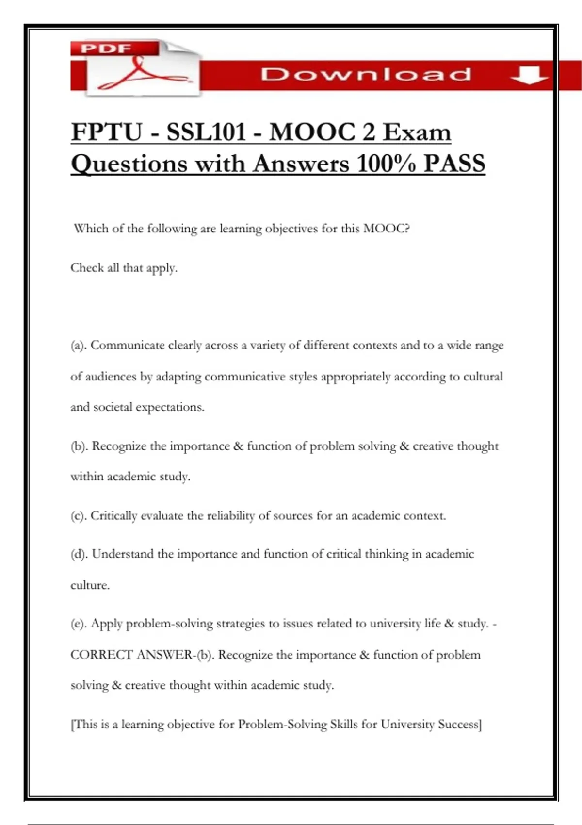 FPTU - SSL101 - MOOC 2 Exam Questions with Answers 100% PASS