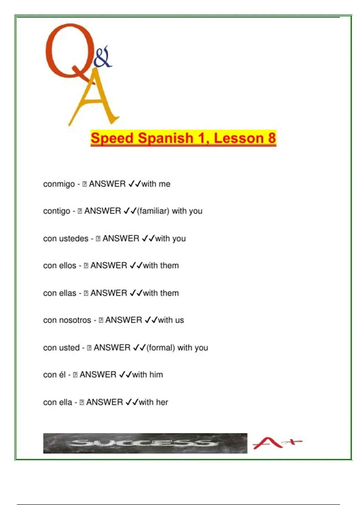 This document contains 120 expertly answered vocabulary questions from Speed Spanish 2, developed for the 2025 academic year. It focuses on building fluency through essential Spanish phrases and question structures, including in-depth usage of tener expressions (tengo hambre, tiene prisa, tengo razón), subject pronouns (yo, tú, él, ella, usted, nosotros), and a broad set of interrogatives (¿Por qué? ¿Quién? ¿Dónde? ¿Cuándo? ¿Qué?). Additional vocabulary supports conversational fluency in practical contexts such as travel, daily activities, ordering at restaurants, and navigating emergencies or logistics (e.g., el aeropuerto, el vuelo, el coche, la tarjeta de crédito, la tienda, la farmacia). The Q&A format allows learners to practice active recall and immediate comprehension, reinforcing both grammar and meaning. This resource is perfect for: – Students in Speed Spanish 2 or Intermediate Spanish I courses – Learners preparing for oral exams, listening comprehension, or Spanish conversation classes – Adult learners, travelers, or healthcare/retail professionals needing functional Spanish – High school or college students reinforcing tener expressions, pronoun usage, and question structures Keywords: Spanish pronouns, tener expressions, Spanish conversation, beginner Spanish, Speed Spanish 2, travel vocabulary Spanish, Spanish questions, tengo hambre, tiene razón, estoy perdido, el vuelo, Spanish hotel vocabulary, Spanish for travelers, LSU Spanish