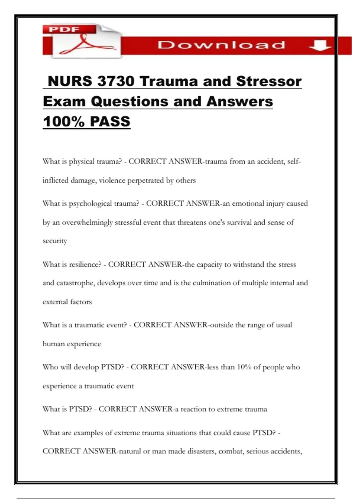 What is PTSD? - CORRECT ANSWER-a reaction to extreme trauma