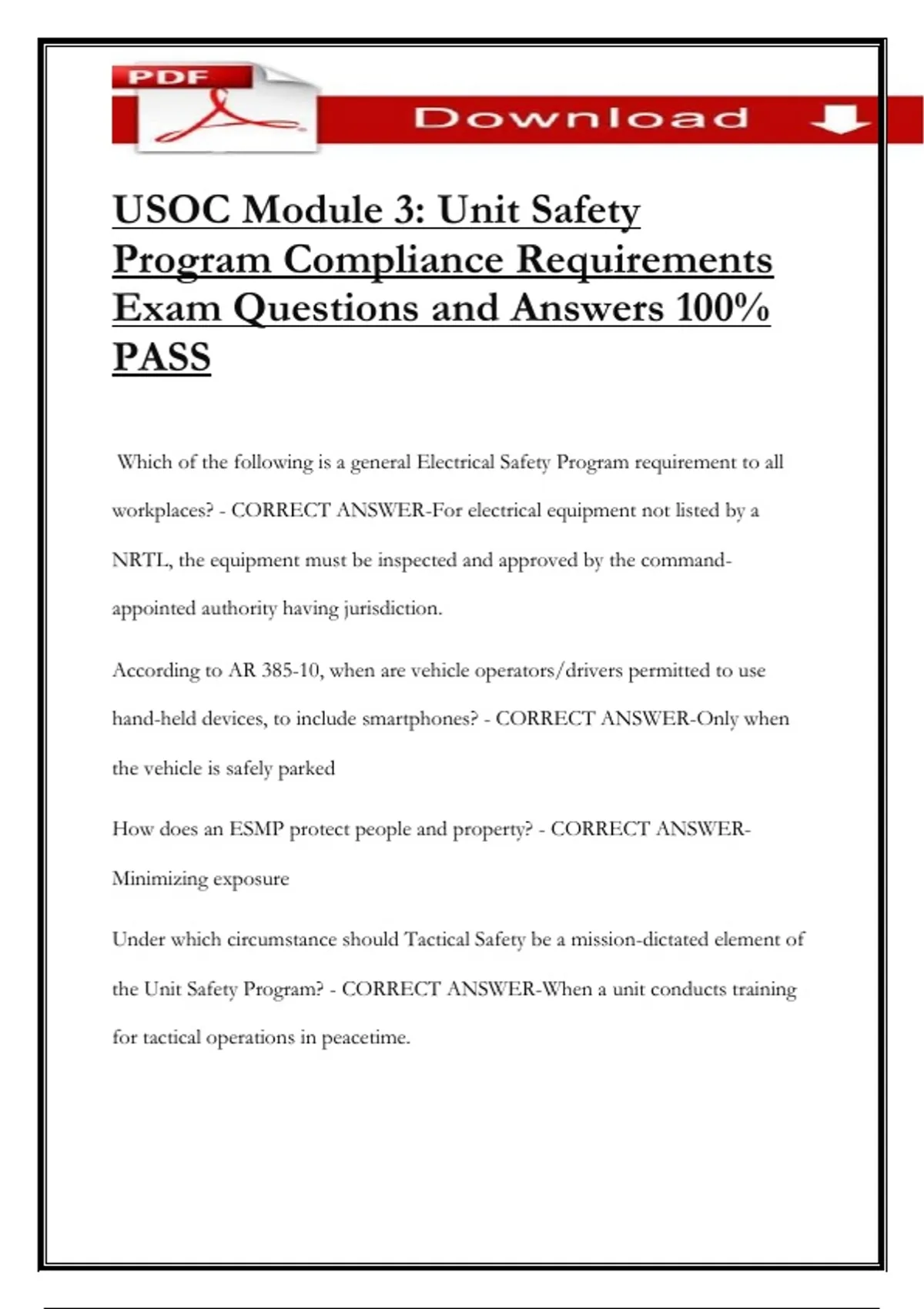 USOC Module 3: Unit Safety Program Compliance Requirements Exam Questions and Answers 100% PASS