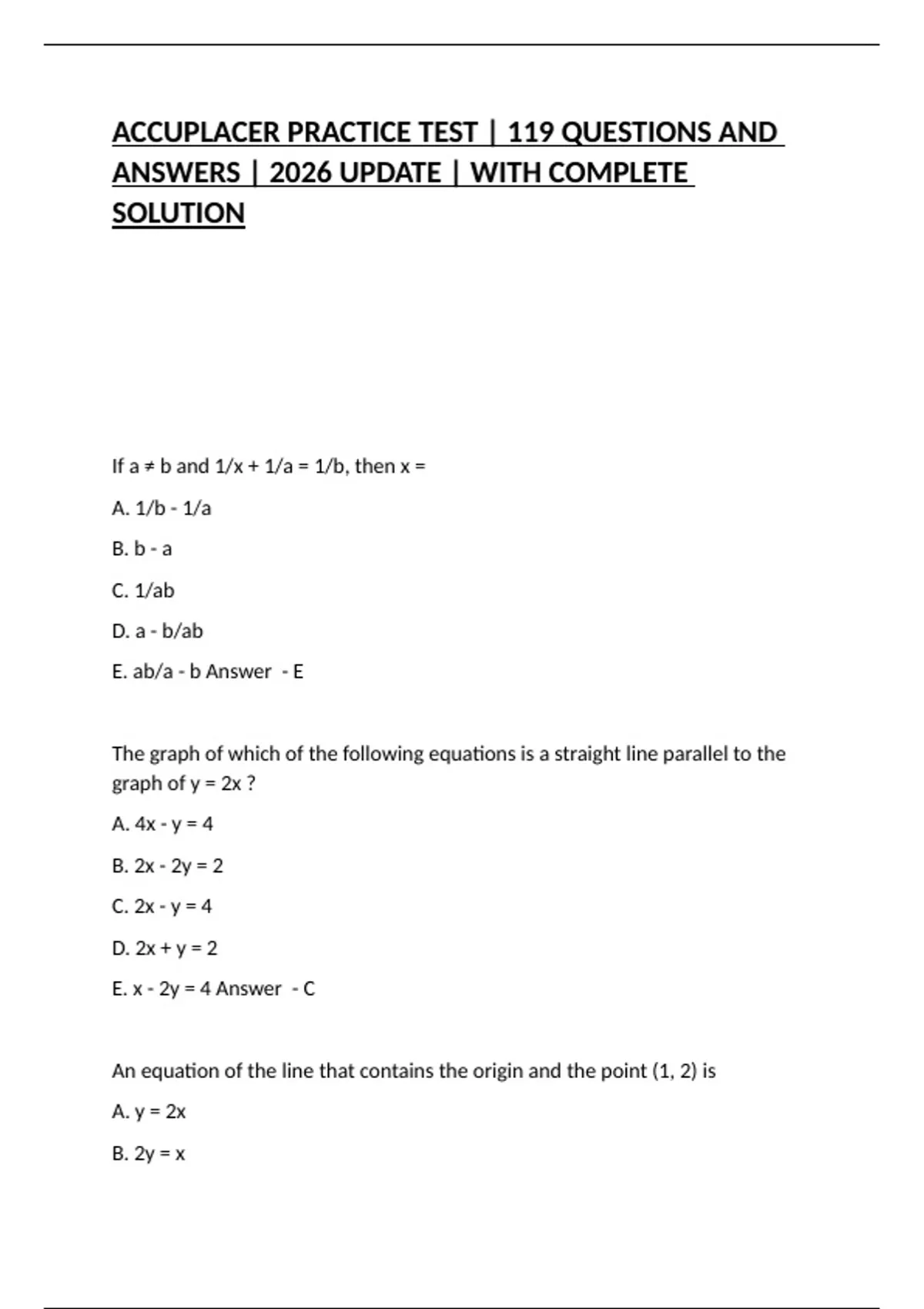 ACCUPLACER PRACTICE TEST | 119 QUESTIONS AND ANSWERS | 2026 UPDATE | WITH COMPLETE SOLUTION