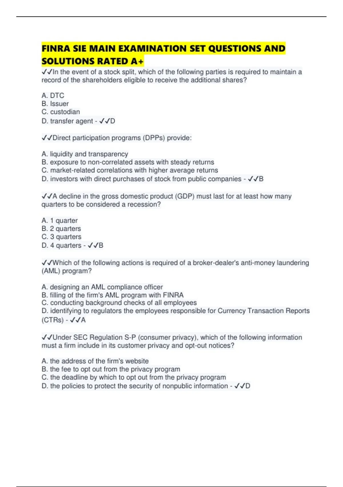 FINRA SIE MAIN EXAMINATION SET QUESTIONS AND SOLUTIONS RATED A+