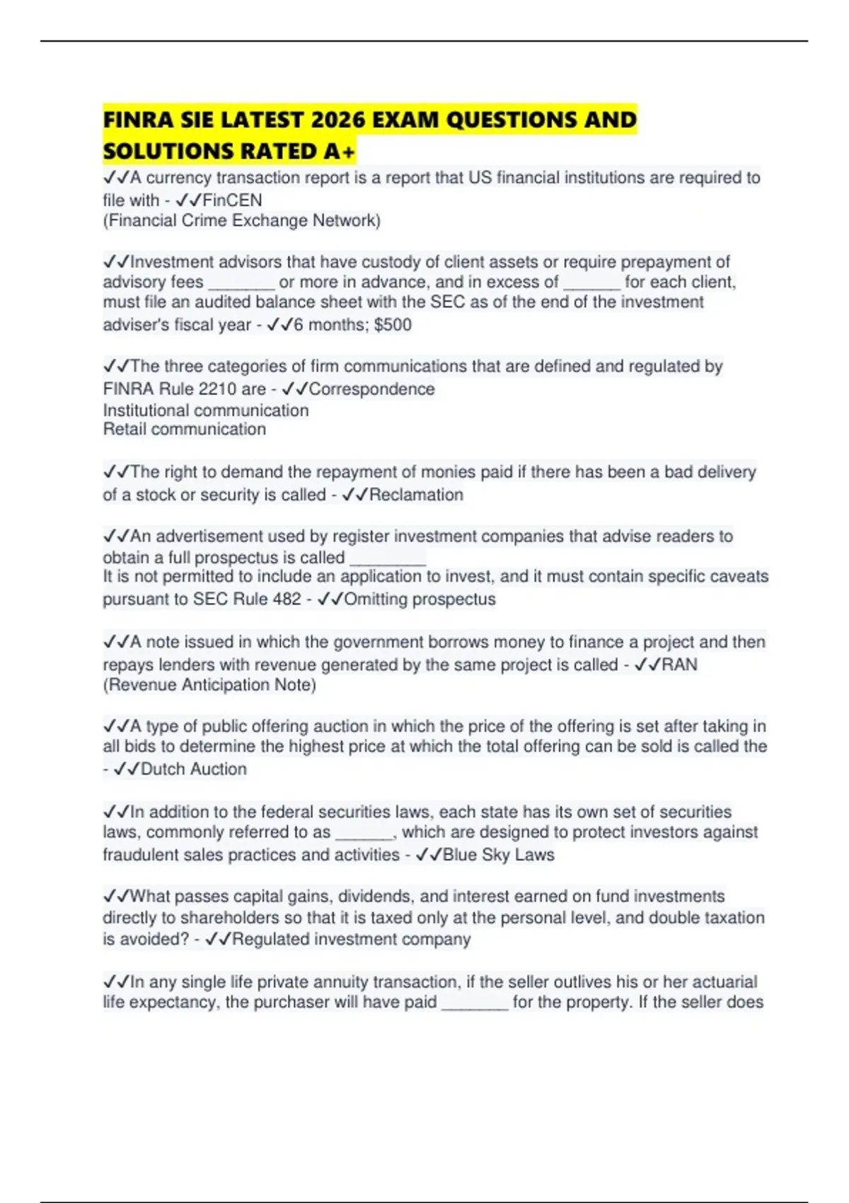 FINRA SIE LATEST 2026 EXAM QUESTIONS AND SOLUTIONS RATED A+