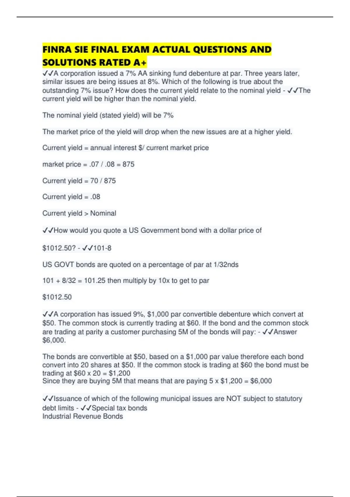 FINRA SIE FINAL EXAM ACTUAL QUESTIONS AND SOLUTIONS RATED A+