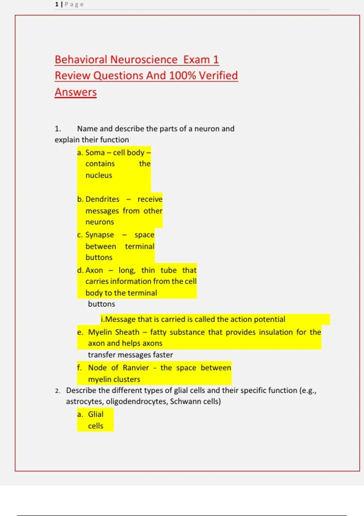 Behavioral Neuroscience Exam 1 Review Questions And 100% Verified Answers 1. Name and describe the parts of a neuron and explain their function a. Soma – cell body – contains the nucleus b. Dendrites – receive messages from other neurons c. Synapse – space between terminal buttons d. Axon – long, thin tube that carries information from the cell body to the terminal buttons i. Message that is carried is called the action potential e. Myelin Sheath – fatty substance that provides insulation for the axon and helps axons transfer messages faster f. Node of Ranvier - the space between myelin clusters 2. Describe the different types of glial cells and their specific function (e.g., astrocytes, oligodendrocytes, Schwann cells) a. Glial cells i. Hold the CNS together ii. Hold neurons in place iii. Insulate messages so they don’t get scrambled iv. Destroy, grow and repair neurons v. Involved in synaptic communication b. Astrocytes i. “Star cell” ii. Provide physical support to neurons iii. Clean up dead cells in the brain iv. Produce chemicals that neurons need to function v. Help the neurons stay in place c. Oligodendrocytes i. Provide support to the axons ii. Produce the myelin sheath iii. Wraps itself around the axons and creates the myelin sheath