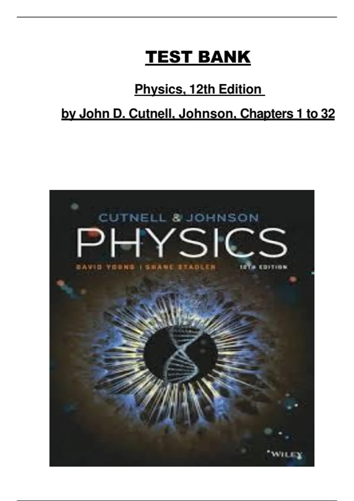 This document contains a comprehensive test bank for Physics, 12th Edition by John D. Cutnell and Johnson, covering chapters 1 through 32. It includes exam-style questions with accurate answers focused on fundamental physics principles, problem-solving, and conceptual understanding across mechanics, thermodynamics, waves, electricity, magnetism, and modern physics, making it ideal for exams, quizzes, and full-course review.