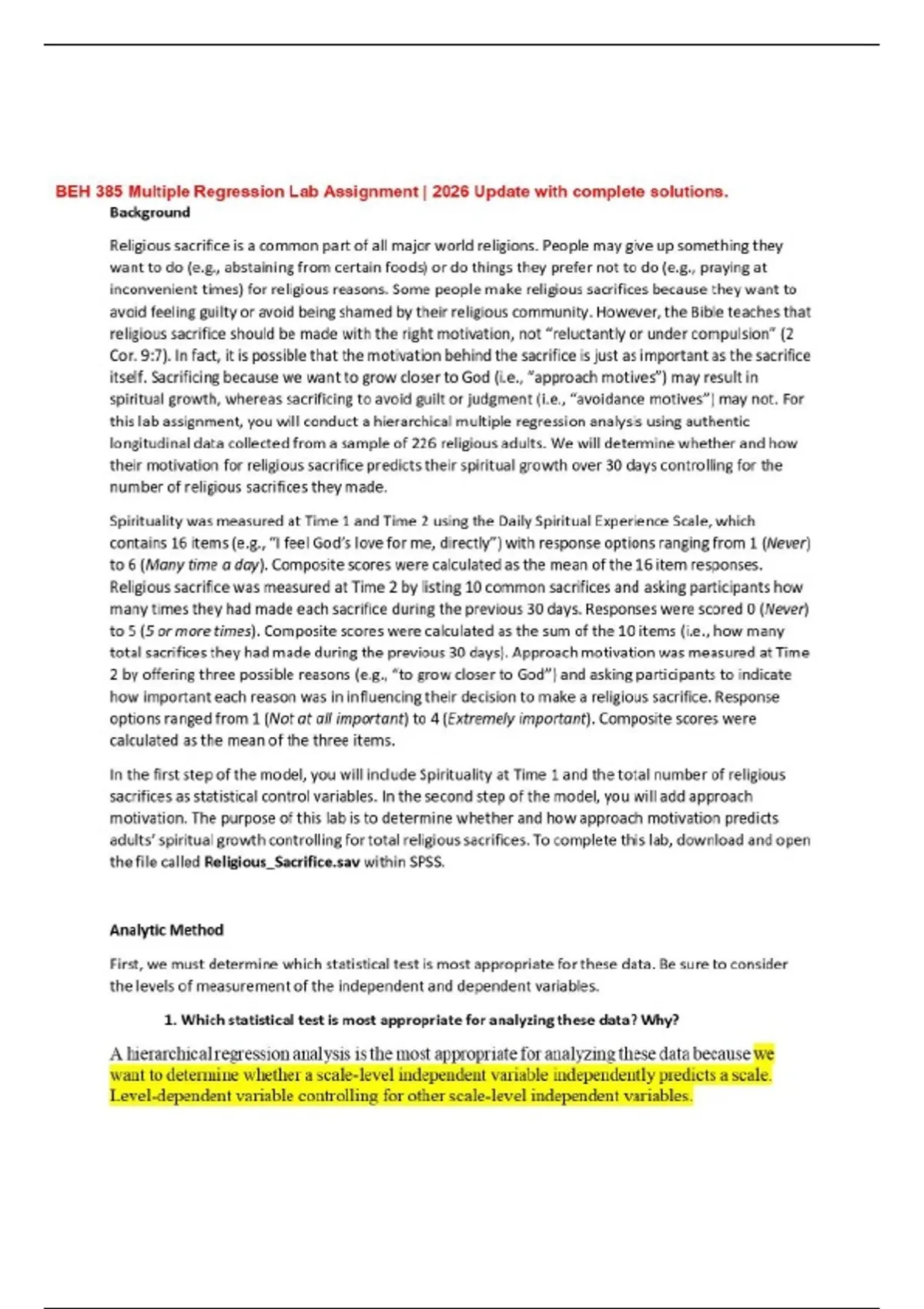 BEH 385 Multiple Regression Lab Assignment | 2026 Update with complete solutions.