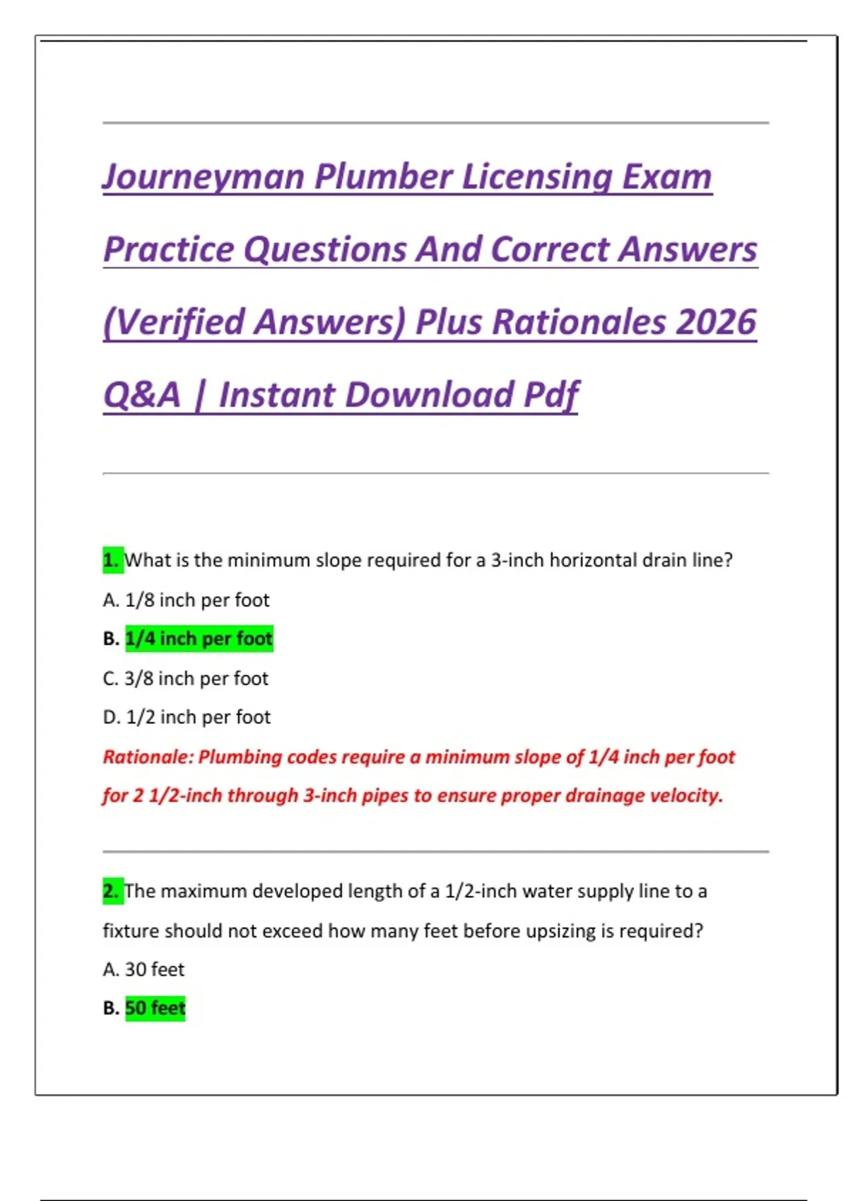 Journeyman Plumber Licensing Exam Practice Questions And Correct Answers (Verified Answers) Plus Rationales 2026 Q&A | Instant Download Pdf