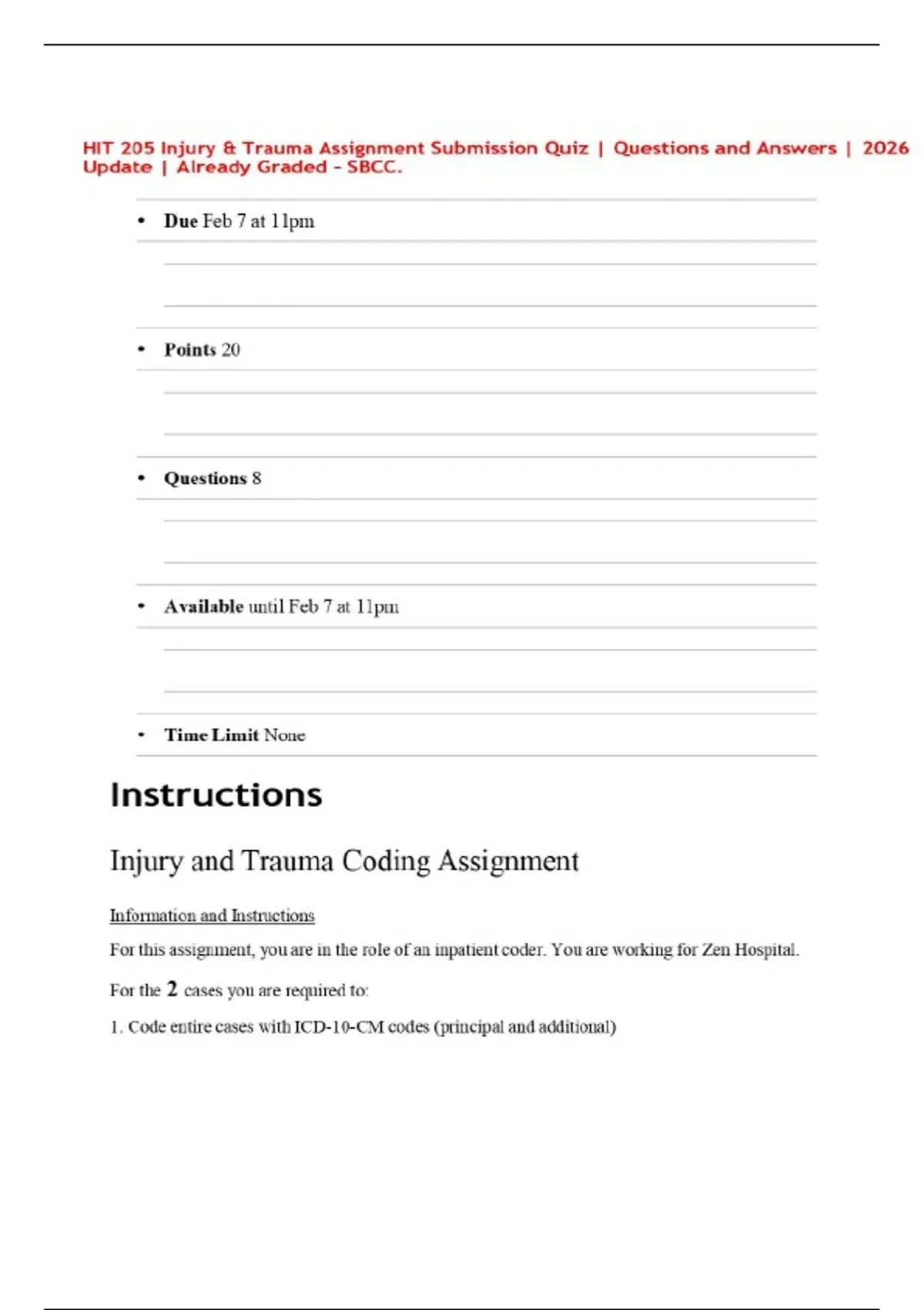 HIT 205 Injury & Trauma Assignment Submission Quiz | Questions and Answers | 2026 Update | Already Graded – SBCC.