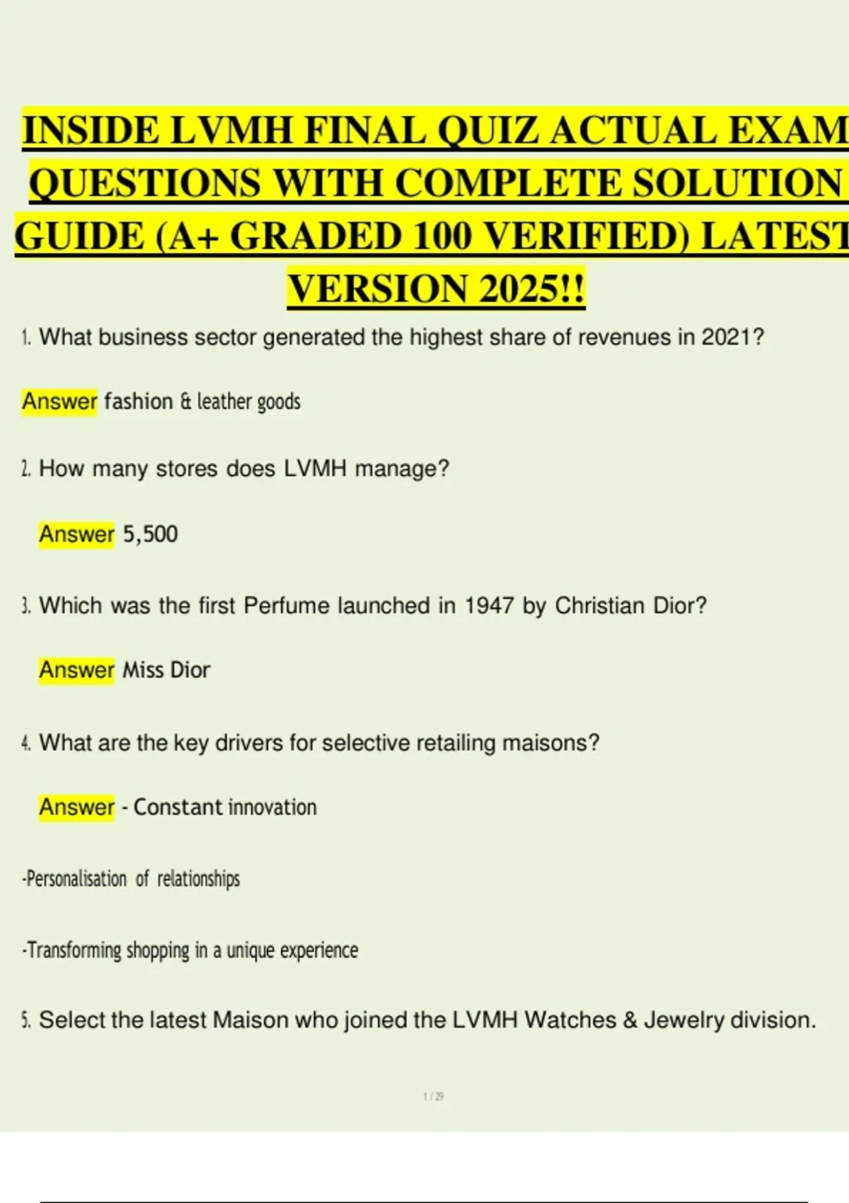 Dominate your Inside LVMH Final Quiz 2025 with this exclusive, fully verified exam solution guide! This latest version contains all actual quiz questions along with complete, correct answers that have been graded A+, giving you the ultimate advantage for a guaranteed top score. With this guide, you will get: 100% verified questions and answers straight from the latest 2025 exam A complete solution guide that explains every answer clearly A time-saving revision resource for students aiming for A+ grades Insights into luxury brand management, LVMH corporate strategy, and real-world applications This guide is perfect for last-minute revision or detailed study, ensuring you walk into your exam fully prepared, confident, and stress-free. Avoid uncertainty and maximize your results with this premium, verified exam resource.