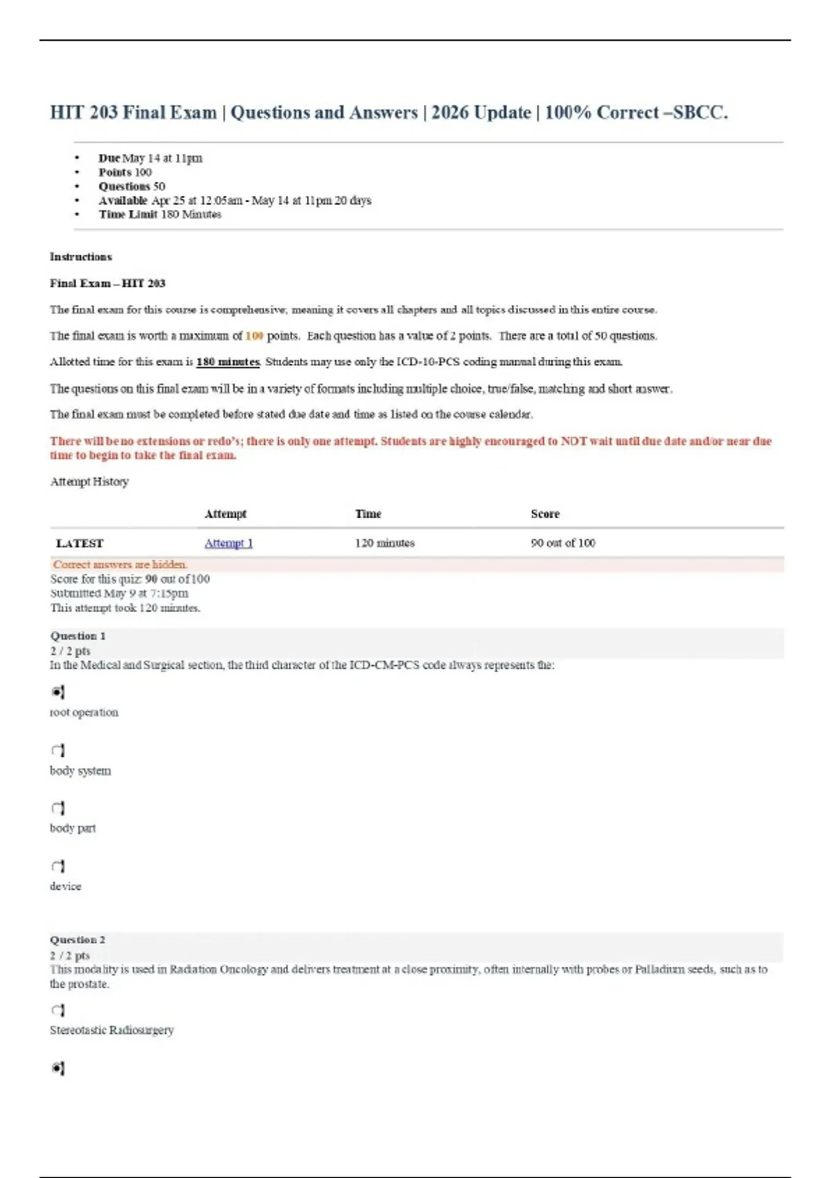 HIT 203 Final Exam | Questions and Answers | 2026 Update | 100% Correct –SBCC.