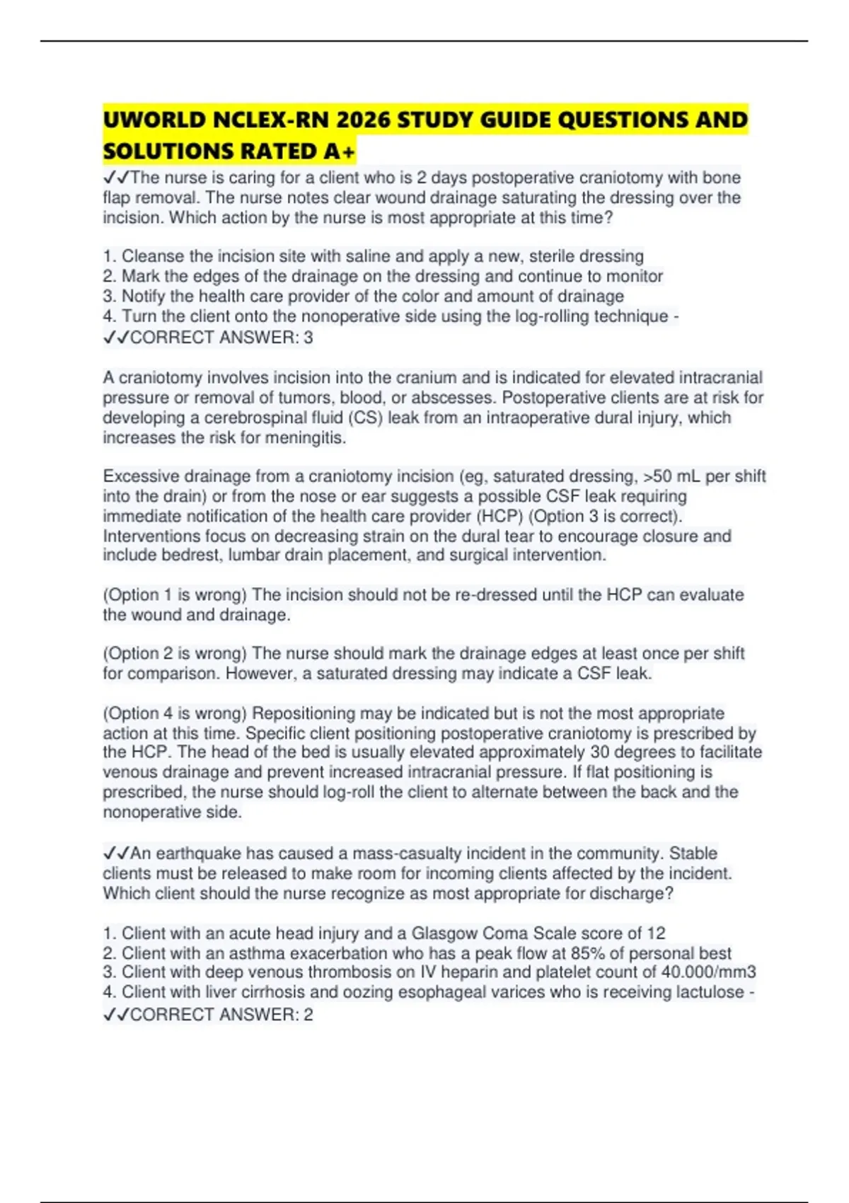 ✔✔The nurse is caring for a client who is 2 days postoperative craniotomy with bone