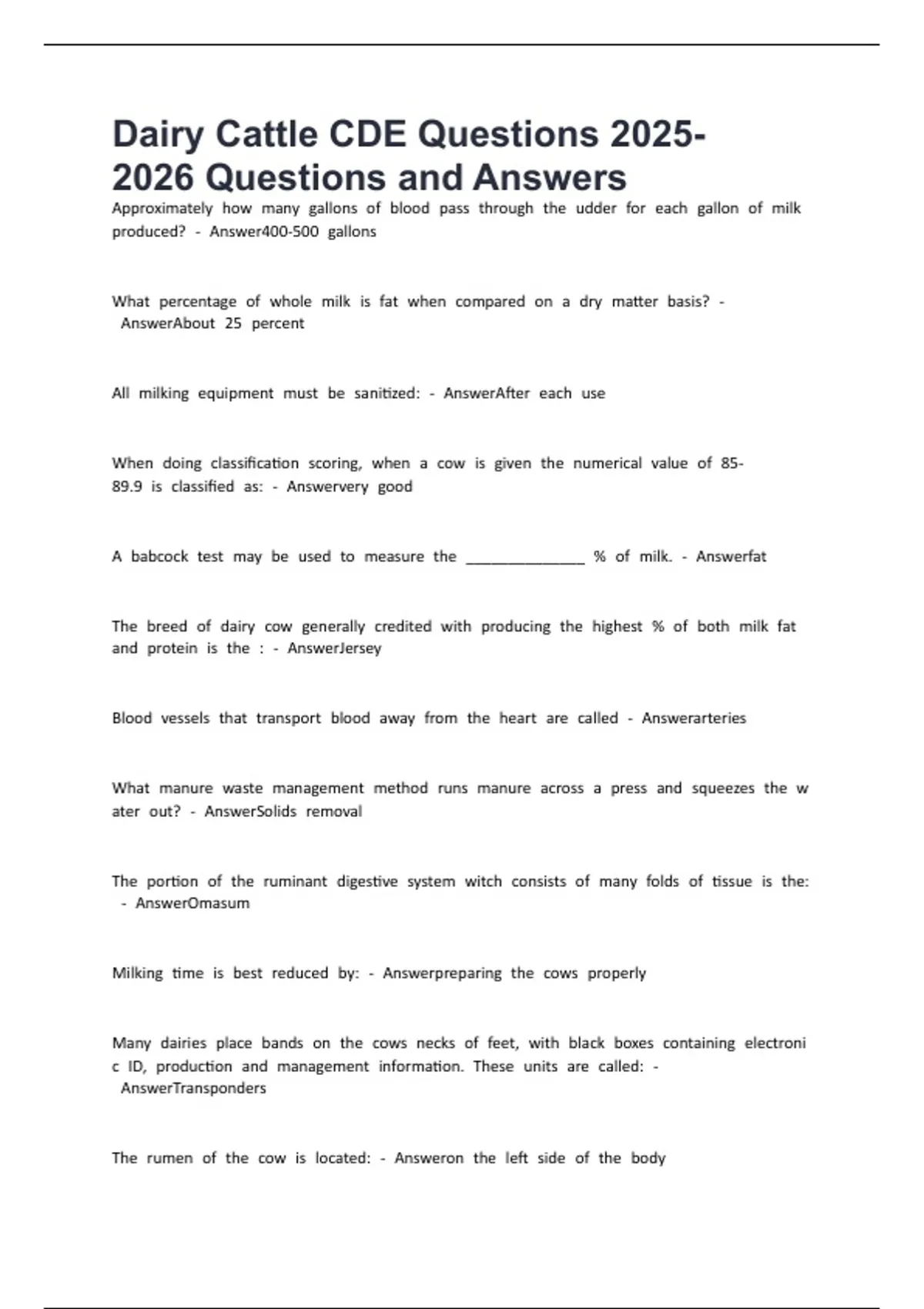 Dairy Cattle CDE Questions Questions and Answers