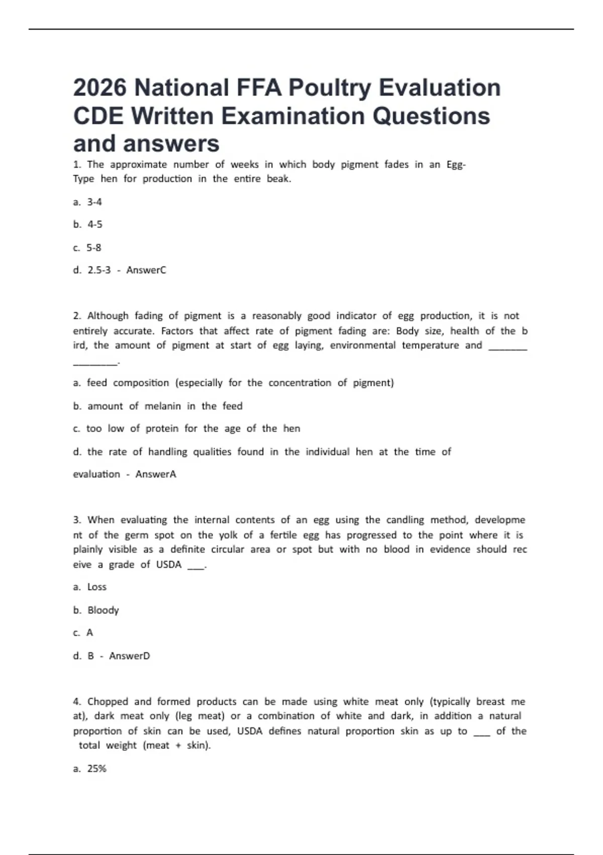 2026 National FFA Poultry Evaluation CDE Written Examination Questions and answers