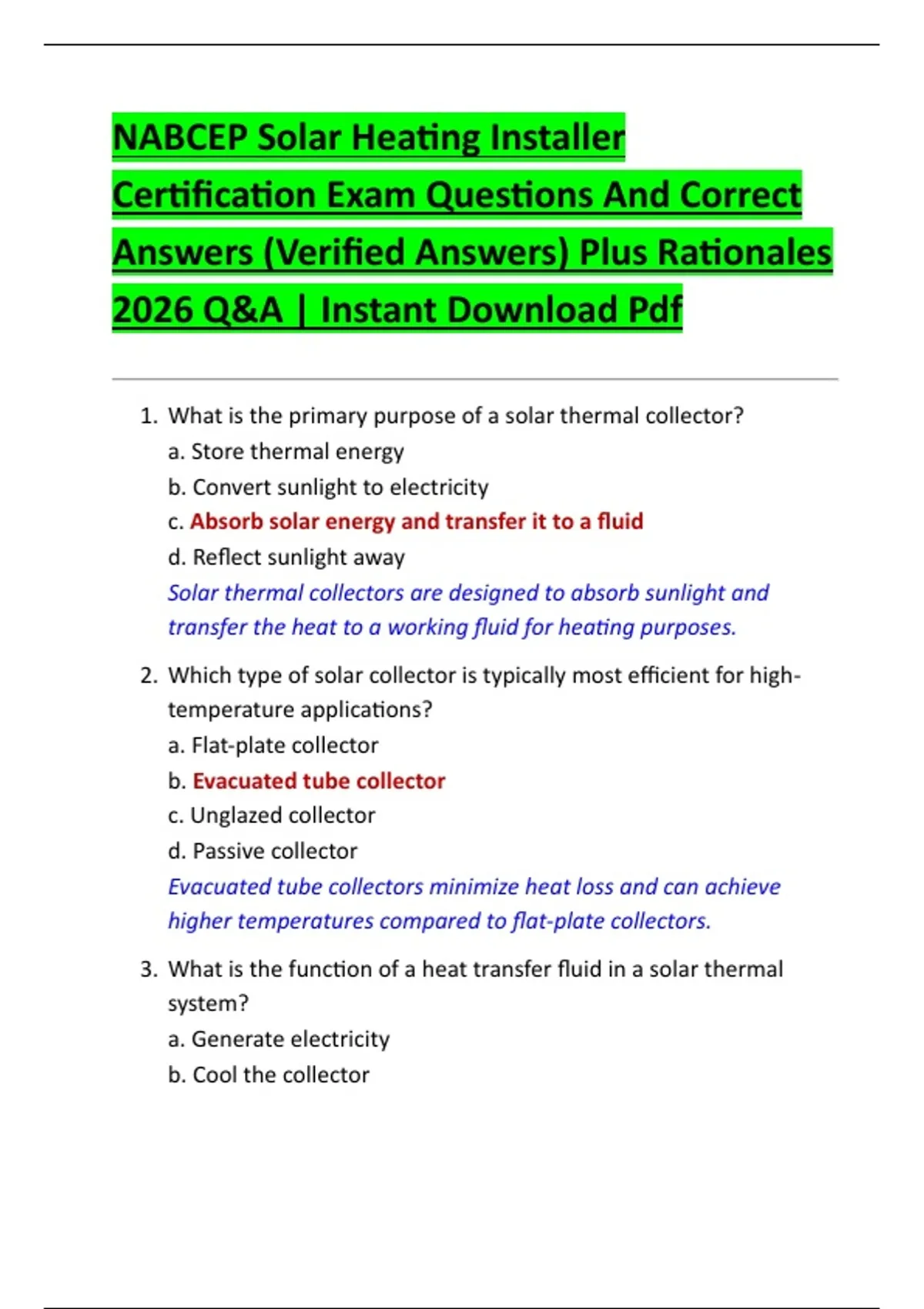 NABCEP Solar Heating Installer Certification Exam Questions And Correct Answers (Verified Answers) Plus Rationales 2026 Q&A | Instant Download Pdf