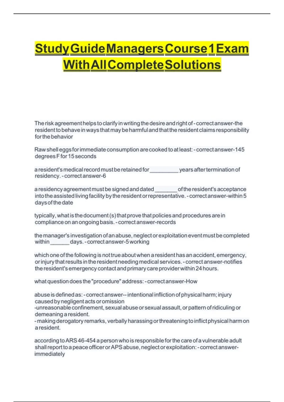 STUDY GUIDE MANAGERS COURSE 1 EXAM WITH ALL COMPLETE SOLUTIONS